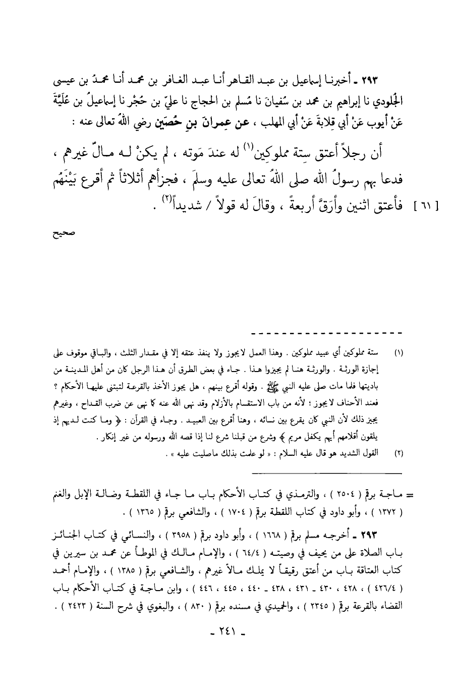 293 - أَخْبَرَنَا إِسْمَاعِيلُ بْنُ عَبْدِ الْقَاهِرِ أَنَا عَبْدُ الْغَافِرِ بْنُ مُحَمَّدٍ أَنَا مُحَمَّدُ بْنُ عِيسَى الْجُلُودِيُّ نا إِبْرَاهِيمُ بْنُ مُحَمَّدِ بْنِ سُفْيَانَ نا مُسْلِمُ بْنُ الْحَجَّاجِ نا عَلِيُّ بْنُ حُجْرٍ نا إِسْمَاعِيلُ بن عُلَيَّةَ عَنْ أَيُّوبَ عَنْ أَبِي قِلابَةَ عَنْ أَبِي الْمُهَلَّبِ عَنْ عِمْرَانَ بْنِ حُصَيْنٍ رَضِيَ اللَّهُ تَعَالَى أَنَّ رَجُلا أَعْتَقَ سِتَّةً مَمْلُوكِينَ لَهُ عِنْدَ مَوْتِهِ لَمْ يَكُنْ لَهُ مَالٌ غَيْرُهُمْ فَدَعَا بِهِمْ رَسُولُ اللَّهِ صَلَّى اللَّهُ تَعَالَى عَلَيْهِ وَسَلَّمَ فَجَزَّأَهُمْ أَثْلاثًا ثُمَّ أَقْرَعَ بَيْنَهُمْ فَأَعْتَقَ اثْنَيْنِ وَأَرَقَّ أَرْبَعَةً وَقَالَ لَهُ قولا شديدا. صحيح