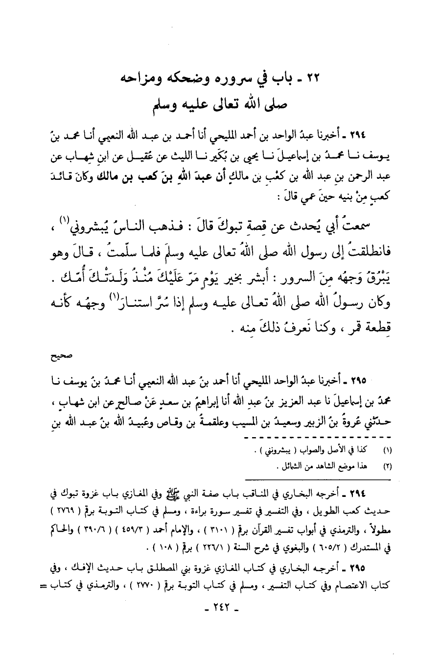 294 - أَخْبَرَنَا عَبْدُ الواحد بن أحمد الْمَلِيحِيُّ أَنَا أَحْمَدُ بْنُ عَبْدِ اللَّهِ النُّعَيْمِيُّ أَنَا مُحَمَّدُ بْنُ يُوسُفَ نا مُحَمَّدُ بْنُ إِسْمَاعِيلَ نا يَحْيَى بْنُ بُكَيْرٍ نا اللَّيْثُ عَنْ عَقِيلٍ عَنِ ابْنِ شِهَابٍ عَنْ عَبْدِ الرَّحْمَنِ بْنِ عَبْدِ اللَّهِ بْنِ كَعْبِ بْنِ مَالِكٍ أَنَّ عَبْدَ اللَّهِ بْنَ كَعْبِ بْنِ مَالِكٍ وَكَانَ قَائِدَ كَعْبٍ مِنْ بَنِيهِ حِينَ عَمِيَ قَالَ سَمِعْتُ أَبِي يُحَدِّثُ عَنْ قِصَّةِ تَبُوكَ قَالَ فَذَهَبَ النَّاسُ يُبَشِّرُونِّي فَانْطَلَقْتُ إِلَى رَسُولِ اللَّهِ صَلَّى اللَّهُ تَعَالَى عَلَيْهِ وَسَلَّمَ فَلَمَّا سَلَّمْتُ قَالَ وَهُوَ يَبْرُقُ وَجْهُهُ مِنَ السُّرُورِ أَبْشِرْ بِخَيْرِ يَوْمٍ مَرَّ عَلَيْكَ مُنْذُ وَلَدَتْكَ أُمُّكَ وَكَانَ رَسُولُ اللَّهِ صَلَّى اللَّهُ تَعَالَى عَلَيْهِ وَسَلَّمَ إِذَا سُرَّ اسْتَنَارَ وَجْهُهُ كَأَنَّهُ قِطْعَةُ قَمَرٍ وَكُنَّا نَعْرِفُ ذلك منه. صحيح
