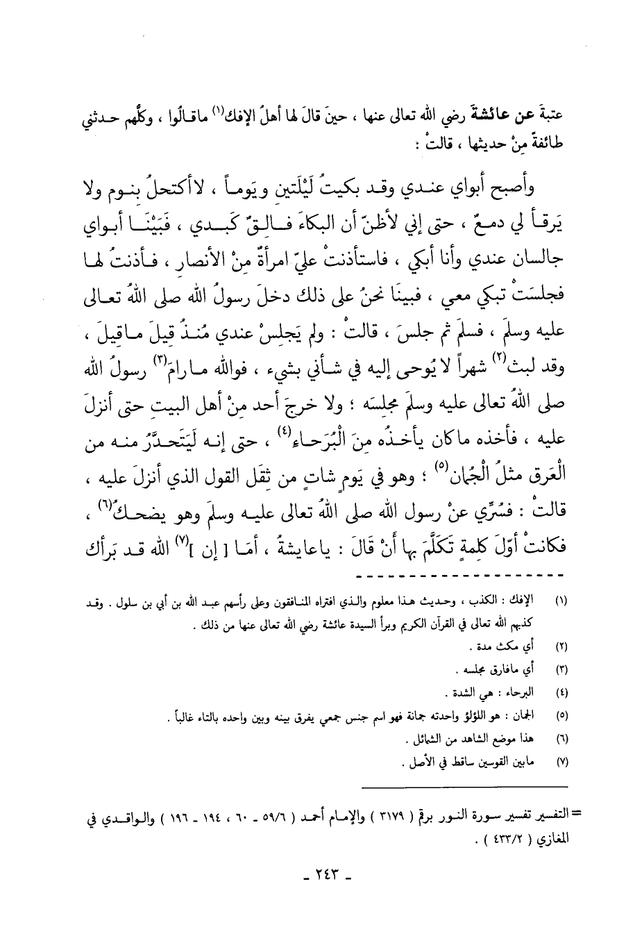 عُتْبَةَ عَنْ عَائِشَةَ رَضِيَ اللَّهُ تَعَالَى عَنْهَا حِينَ قَالَ لَهَا أَهْلُ الإِفْكِ مَا قَالُوا وَكُلُّهُمْ حَدَّثَنِي طَائِفَةً مِنْ حَدِيثِهَا قَالَتْ وَأَصْبَحَ أَبَوَايَ عِنْدِي وَقَدْ بَكَيْتُ لَيْلَتَيْنِ وَيَوْمًا لا أَكْتَحِلُ بِنَوْمٍ وَلا يَرْقَأُ لِي دَمْعٌ حَتَّى إِنِّي لأَظُنُّ أَنَّ الْبُكَاءَ فَالِقُ كَبِدِي فَبَيْنَا أَبَوَايَ جَالِسَانِ عِنْدِي وَأَنَا أَبْكِي فَاسْتَأْذَنَتْ عَلَيَّ امْرَأَةٌ مِنَ الأَنْصَارِ فَأَذِنْتُ لَهَا فَجَلَسَتْ تَبْكِي مَعِي فَبَيْنَا نَحْنُ عَلَى ذَلِكَ دَخَلَ رَسُولُ اللَّهِ صَلَّى اللَّهُ تَعَالَى عَلَيْهِ وَسَلَّمَ فَسَلَّمَ ثُمَّ جَلَسَ قَالَتْ وَلَمْ يَجْلِسْ عِنْدِي مُنْذُ قِيلَ مَا قِيلَ وَقَدْ لَبِثَ شَهْرًا لا يُوحَى إِلَيْهِ فِي شَأْنِي بِشَيْءٍ فَوَاللَّهِ مَا رَامَ رَسُولُ اللَّهِ صَلَّى اللَّهُ تَعَالَى عَلَيْهِ وَسَلَّمَ مَجْلِسَهُ وَلا خَرَجَ أَحَدٌ مِنْ أَهْلِ الْبَيْتِ حَتَّى أُنْزِلَ عَلَيْهِ فَأَخَذَهُ مَا كَانَ يَأْخُذُهُ مِنَ الْبَرْحَاءِ حَتَّى إِنَّهُ لَيَتَحَدَّرُ مِنْهُ مِنَ الْعَرَقِ مِثْلُ الْجُمَانِ وَهُوَ فِي يَوْمٍ شَاتٍ مِنْ ثِقَلِ الْقَوْلِ الَّذِي أُنْزِلَ عَلَيْهِ قَالَتْ فَسُرِّيَ عَنْ رَسُولِ اللَّهِ صَلَّى اللَّهُ تَعَالَى عَلَيْهِ وَسَلَّمَ وَهُوَ يَضْحَكُ فَكَانَتْ أَوَّلَ كَلِمَةٍ تَكَلَّمَ بِهَا أَنْ قال يا عايشة أَمَا إِنَّ اللَّهَ قَدْ بَرَّأَكِ