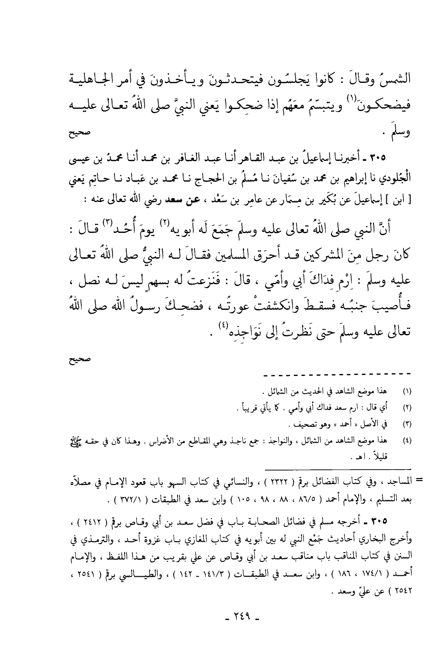 305 - أَخْبَرَنَا إِسْمَاعِيلُ بْنُ عَبْدِ الْقَاهِرِ أَنَا عَبْدُ الْغَافِرِ بْنُ مُحَمَّدٍ أَنَا مُحَمَّدُ بْنُ عِيسَى الْجُلُودِيُّ نا إِبْرَاهِيمُ بْنُ مُحَمَّدِ بْنِ سُفْيَانَ نا مُسْلِمُ بْنُ الْحَجَّاجِ نا مُحَمَّدُ بْنُ عَبَّادٍ نا حَاتِمٌ يَعْنِي ابْنَ إِسْمَاعِيلَ عَنْ بُكَيْرِ بْنِ مِسْمَارٍ عَنْ عَامِرِ بْنِ سَعْدٍ عَنْ سَعْدٍ رَضِيَ اللَّهُ تَعَالَى عَنْهُ أَنَّ النَّبِيَّ صَلَّى اللَّهُ تَعَالَى عَلَيْهِ وَسَلَّمَ جَمَعَ لَهُ أَبَوَيْهِ يَوْمَ أُحُدٍ قَالَ كَانَ رَجُلٌ مِنَ الْمُشْرِكِينَ قَدْ أَحْرَقَ الْمُسْلِمِينَ فَقَالَ لَهُ النَّبِيُّ صَلَّى اللَّهُ تَعَالَى عَلَيْهِ وَسَلَّمَ ارْمِ فِدَاكَ أَبِي وَأُمِّي قَالَ فَنَزَعْتُ لَهُ بِسَهْمٍ لَيْسَ لَهُ نَصْلٌ فَأُصِيبُ جَنْبُهُ فَسَقَطَ وَانْكَشَفَتْ عَوْرَتُهُ فَضَحِكَ رَسُولُ اللَّهِ صَلَّى اللَّهُ تَعَالَى عَلَيْهِ وَسَلَّمَ حَتَّى نَظَرْتُ إلى نواجذه. صحيح