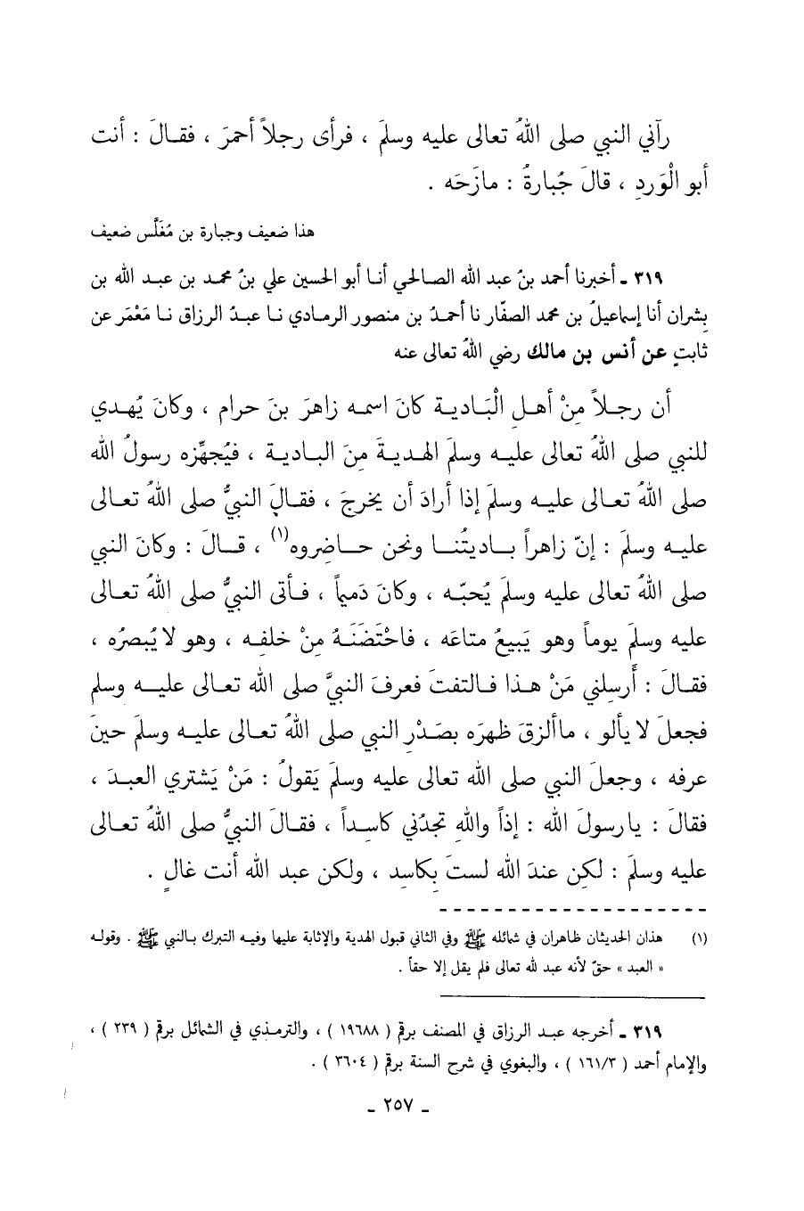 319 - أَخْبَرَنَا أَحْمَدُ بْنُ عَبْدِ اللَّهِ الصَّالِحِيُّ أَنَا أَبُو الْحُسَيْنِ عَلِيُّ بْنُ مُحَمَّدِ بْنِ عَبْدِ اللَّهِ بْنِ بِشْرَانَ أَنَا إِسْمَاعِيلُ بْنُ مُحَمَّدٍ الصَّفَّارُ نا أَحْمَدُ بْنُ مَنْصُورٍ الرَّمَادِيُّ نا عَبْدُ الرَّزَّاقِ نا مَعْمَرٌ عَنْ ثَابِتٍ عَنْ أَنَسِ بْنِ مَالِكٍ رَضِيَ اللَّهُ تَعَالَى عَنْهُ أَنَّ رَجُلا مِنْ أَهْلِ الْبَادِيَةِ كَانَ اسْمُهُ زَاهِرَ بْنَ حَرَامٍ وَكَانَ يُهْدِي لِلنَّبِيِّ صَلَّى اللَّهُ تَعَالَى عَلَيْهِ وَسَلَّمَ الْهَدِيَّةَ مِنَ الْبَادِيَةِ فَيُجَهِّزُهُ رَسُولُ اللَّهِ صَلَّى اللَّهُ تَعَالَى عَلَيْهِ وَسَلَّمَ إِذَا أَرَادَ أَنْ يَخْرُجَ فَقَالَ النَّبِيُّ صَلَّى اللَّهُ تَعَالَى عَلَيْهِ وَسَلَّمَ إِنَّ زَاهِرًا بَادِيَتُنَا وَنَحْنُ حَاضِرُوهُ قَالَ وَكَانَ النَّبِيُّ صَلَّى اللَّهُ تَعَالَى عَلَيْهِ وَسَلَّمَ يُحِبُّهُ وَكَانَ دميما فأتى النبي صَلَّى اللَّهُ تَعَالَى عَلَيْهِ وَسَلَّمَ يَوْمًا وهو يبيع متاع فَاحْتَضَنَهُ مِنْ خَلْفِهِ وَهُوَ لا يُبْصِرُهُ فَقَالَ أَرْسِلْنِي مَنْ هَذَا فَالْتَفَتَ فَعَرَفَ النَّبِيَّ صَلَّى اللَّهُ تَعَالَى عَلَيْهِ وَسَلَّمَ فَجَعَلَ لا يَأْلُو مَا أَلْزَقَ ظَهْرَهُ بِصَدْرِ النَّبِيِّ صَلَّى اللَّهُ تَعَالَى عَلَيْهِ وَسَلَّمَ حِينَ عَرَفَهُ وَجَعَلَ النَّبِيُّ صَلَّى اللَّهُ تَعَالَى عَلَيْهِ وَسَلَّمَ يَقُولُ مَنْ يَشْتَرِي الْعَبْدَ فَقَالَ يَا رَسُولَ اللَّهِ إِذًا وَاللَّهِ تَجِدُنِي كَاسِدًا فَقَالَ النَّبِيُّ صَلَّى اللَّهُ تَعَالَى عَلَيْهِ وَسَلَّمَ لَكِنْ عِنْدَ اللَّهِ لَسْتَ بِكَاسِدٍ وَلَكِنْ عَبْدَ اللَّهِ أَنْتَ غَالٍ.