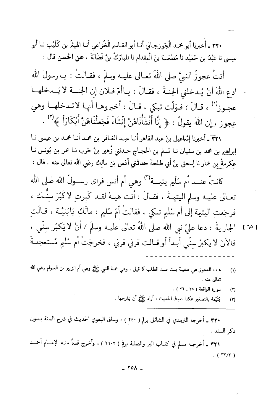 320 - أَخْبَرَنَا أَبُو مُحَمَّدٍ الْجُوزَجَانِيُّ أَنَا أَبُو الْقَاسِمِ الْخُزَاعِيُّ أَنَا الْهَيْثَمُ بْنُ كُلَيْبٍ نا أَبُو عِيسَى نا عَبْدُ بْنُ حُمَيْدٍ نا مُصْعَبُ بْنُ الْمِقْدَامِ نا الْمُبَارَكُ بْنُ فَضَالَةَ عَنِ الْحَسَنِ قَالَ أَتَتْ عَجُوزٌ النَّبِيَّ صَلَّى اللَّهُ تَعَالَى عَلَيْهِ وَسَلَّمَ فَقَالَتْ يَا رَسُولَ اللَّهِ ادْعُ اللَّهَ أَنْ يُدْخِلَنِي الْجَنَّةَ فَقَالَ يَا أُمَّ فُلانٍ إِنَّ الْجَنَّةَ لا يَدْخُلُهَا عَجُوزٌ قَالَ فَوَلَّتْ تَبْكِي قَالَ أَخْبِرُوهَا أَنَّهَا لا تَدْخُلُهَا وَهِيَ عَجُوزٌ إِنَّ اللَّهَ يَقُولُ إِنَّا أَنْشَأْنَاهُنَّ إِنْشَاءً فَجَعَلْنَاهُنَّ أَبْكَارًا.