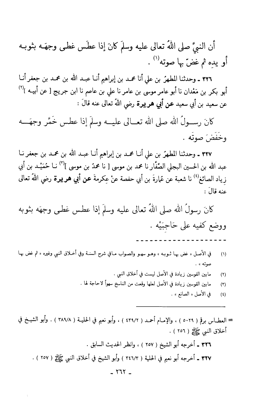 327 - وَحَدَّثَنَا الْمُطَهَّرُ بْنُ عَلِيٍّ أَنَا مُحَمَّدُ بْنُ إِبْرَاهِيمَ أَنَا عَبْدُ اللَّهِ بْنُ مُحَمَّدِ بْنِ جَعْفَرٍ نا عَبْدُ اللَّهِ بْنُ الْحُسَيْنِ الْبَجَلِيُّ الصَّفَّارُ نا مُحَمَّدُ بْنُ موسى نا محمد بن مُوسَى نا حُمَيْدُ بْنُ أَبِي زِيَادٍ الصَّائِغُ نا شُعْبَةُ عَنْ عِمَارَةَ بْنِ أَبِي حَفْصَةَ عَنْ عِكْرِمَةَ عَنْ أَبِي هُرَيْرَةَ رَضِيَ اللَّهُ تَعَالَى عَنْهُ قَالَ كَانَ رَسُولُ اللَّهِ صَلَّى اللَّهُ تَعَالَى عَلَيْهِ وَسَلَّمَ إِذَا عَطَسَ غَطَّى وَجْهَهُ بِثَوْبِهِ وَوَضَعَ كَفَّيْهِ عَلَى حَاجِبَيْهِ.