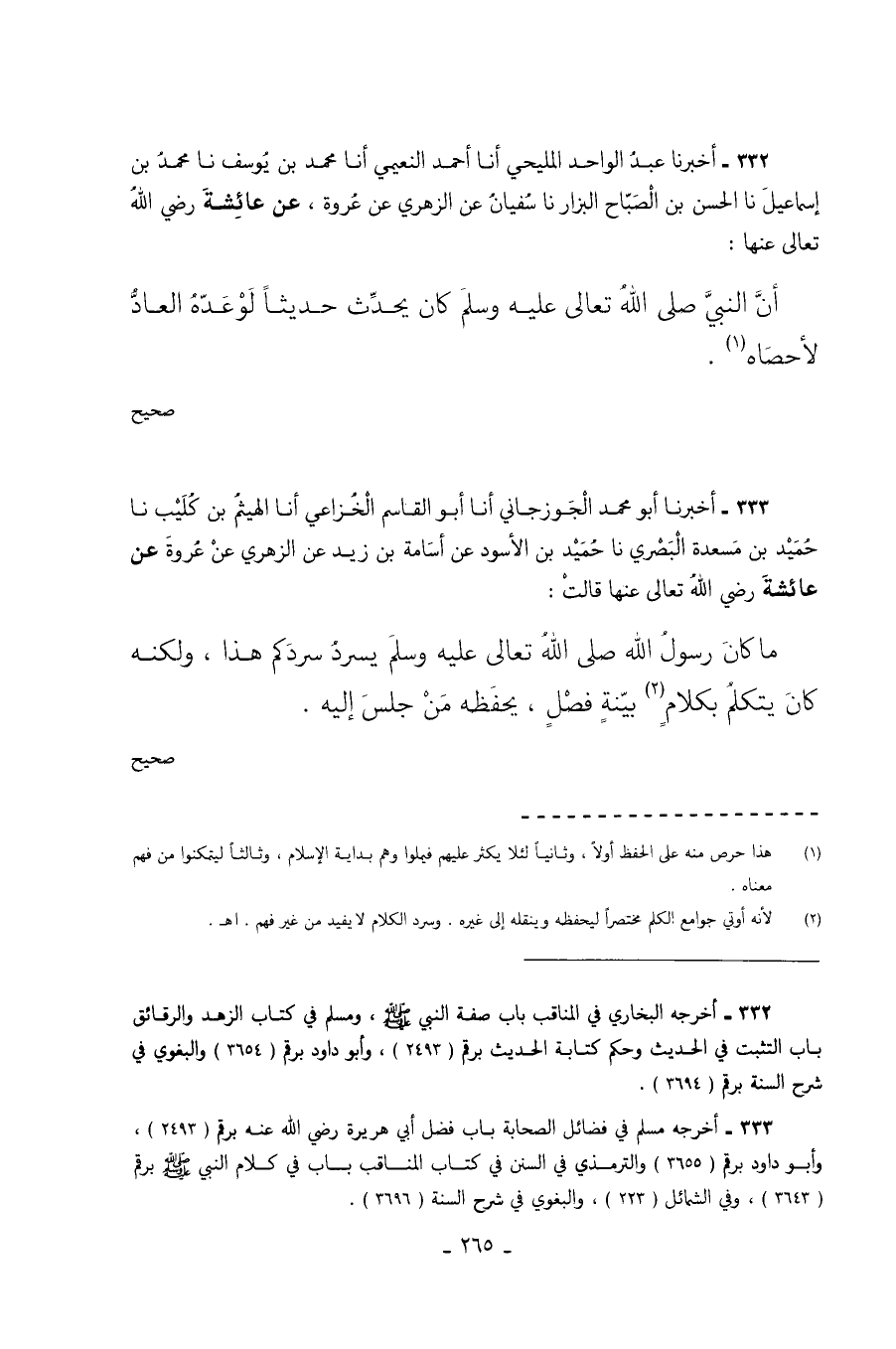 333 - أَخْبَرَنَا أَبُو مُحَمَّدٍ الْجُوزَجَانِيُّ أَنَا أَبُو الْقَاسِمِ الْخُزَاعِيُّ أَنَا الْهَيْثَمُ بْنُ كُلَيْبٍ نا حُمَيْدُ بْنُ مَسْعَدَةَ الْبَصْرِيُّ نا حُمَيْدُ بْنُ الأَسْوَدِ عَنْ أُسَامَةَ بْنِ زَيْدٍ عَنِ الزُّهْرِيِّ عَنْ عُرْوَةَ عَنْ عَائِشَةَ رَضِيَ اللَّهُ تَعَالَى عَنْهَا قَالَتْ مَا كَانَ رَسُولُ اللَّهِ صَلَّى اللَّهُ تَعَالَى عَلَيْهِ وَسَلَّمَ يَسْرُدُ سَرْدَكُمْ هَذَا وَلَكِنَّهُ كَانَ يَتَكَلَّمُ بِكَلامٍ بَيِّنَةٍ فَصْلٍ يَحْفَظُهُ مَنْ جلس إليه. صحيح