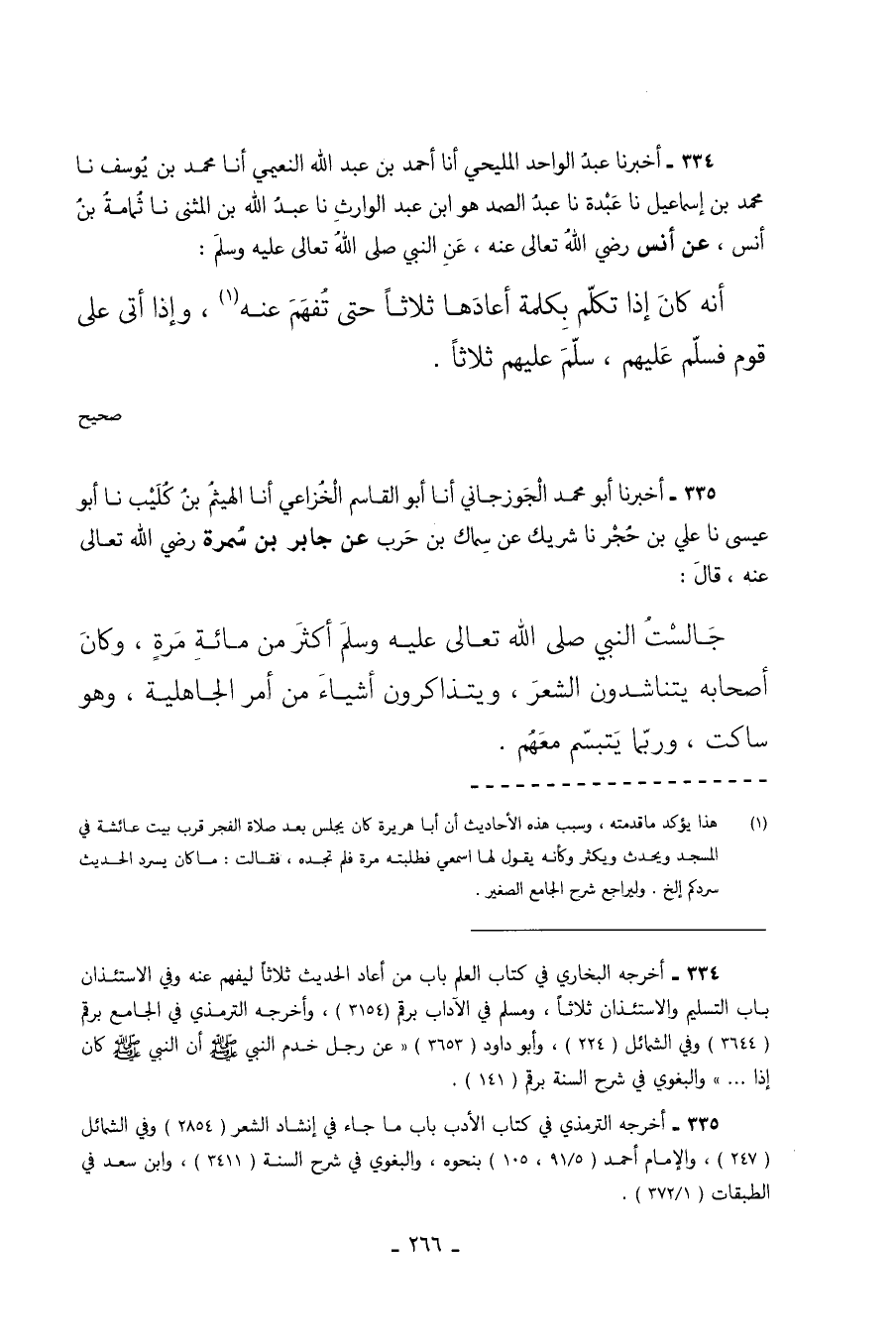 334 - أَخْبَرَنَا عَبْدُ الْوَاحِدِ الْمَلِيحِيُّ أَنَا أَحْمَدُ بْنُ عَبْدِ اللَّهِ النُّعَيْمِيُّ أَنَا مُحَمَّدُ بْنُ يُوسُفَ نا مُحَمَّدُ بْنُ إِسْمَاعِيلَ نا عَبْدَةُ نا عَبْدُ الصَّمَدِ هُوَ ابْنُ عَبْدِ الْوَارِثِ نا عَبْدُ اللَّهِ بْنُ الْمُثَنَّى نا ثُمَامَةُ بْنُ أَنَسٍ عَنْ أَنَسٍ رَضِيَ اللَّهُ تَعَالَى عَنْهُ عَنِ النَّبِيِّ صَلَّى اللَّهُ تَعَالَى عَلَيْهِ وَسَلَّمَ أَنَّهُ كَانَ إِذَا تَكَلَّمَ بِكَلِمَةٍ أَعَادَهَا ثَلاثًا حَتَّى تُفْهَمَ عَنْهُ وَإِذَا أَتَى عَلَى قَوْمٍ فَسَلَّمَ عَلَيْهِمْ سَلَّمَ عليهم ثلاثا. صحيح