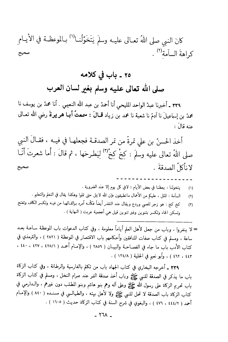 كَانَ النَّبِيُّ صَلَّى اللَّهُ تَعَالَى عَلَيْهِ وَسَلَّمَ يَتَخَوَّلُنَا بِالْمَوْعِظَةِ فِي الأَيَّامِ كراهة السآمة. صحيح