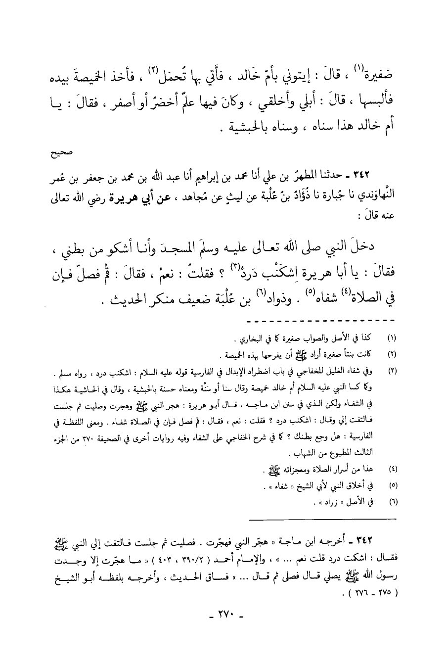 342 - حَدَّثَنَا الْمُطَهَّرُ بْنُ عَلِيٍّ أَنَا مُحَمَّدُ بْنُ إِبْرَاهِيمَ أَنَا عَبْدُ اللَّهِ بْنُ محمد بن جَعْفَرِ بْن عُمَرَ النُّهَاوَنْدِيُّ نا جُبَارَةُ نا ذُؤَادُ بْنُ عُلْبَةَ عَنْ لَيْثٍ عَنْ مُجَاهِدٍ عَنْ أَبِي هُرَيْرَةَ رَضِيَ اللَّهُ تَعَالَى عَنْهُ قَالَ دخل النَّبِيُّ صَلَّى اللَّهُ تَعَالَى عَلَيْهِ وَسَلَّمَ الْمَسْجِدَ وَأَنَا أَشْكُو مِنْ بَطْنِي فَقَالَ يَا أَبَا هُرَيْرَةَ اشْكَنْبَ دَرَدْ فَقُلْتُ نَعَمْ فَقَالَ قُمْ فَصَلِّ فَإِنَّ فِي الصَّلاةِ شِفَاهُ. وَذُوَادُ بْنُ عُلْبَةَ ضَعِيفٌ مُنْكَرُ الْحَدِيثِ