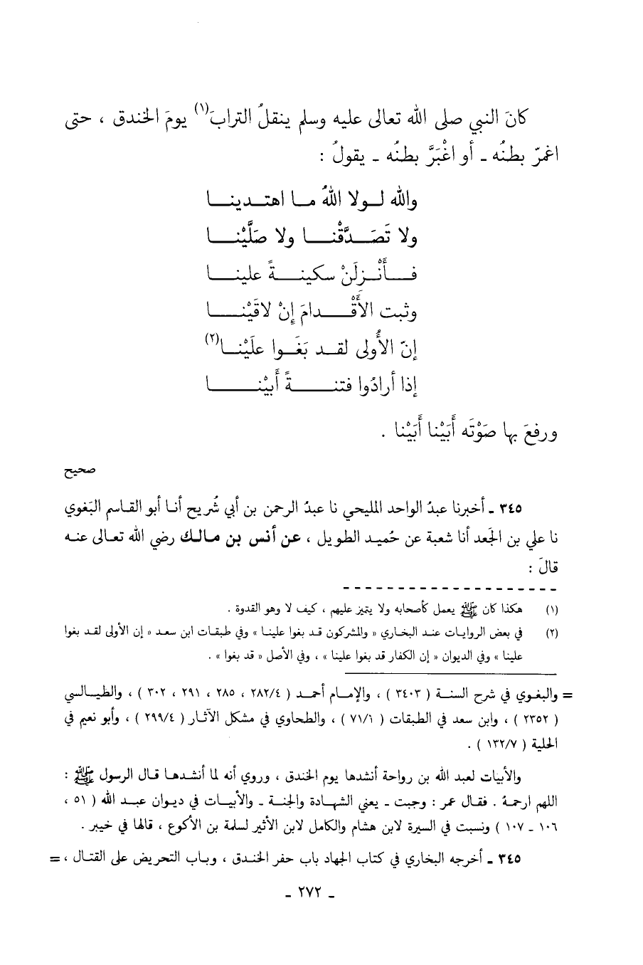 كَانَ النَّبِيُّ صَلَّى اللَّهُ تَعَالَى عَلَيْهِ وَسَلَّمَ يَنْقِلُ التُّرَابَ يَوْمَ الْخَنْدَقِ حَتَّى اغْمَرَّ بَطْنُهُ أَوِ اغْبَرَّ بَطْنُهُ يَقُولُ وَاللَّهِ لَوْلا اللَّهُ مَا اهْتَدَيْنَا وَلا تَصَدَّقْنَا وَلا صَلَّيْنَا فَأَنْزِلَنْ سَكِينَةً عَلَيْنَا وَثَبِّتِ الأَقْدَامَ إِنْ لاقَيْنَا إن الأولى لقد بَغَوْا عَلَيْنَا إِذَا أَرَادُوا فِتْنَةً أَبَيْنَا. وَرَفَعَ بِهَا صَوْتَهُ أبينا أبينا. صحيح