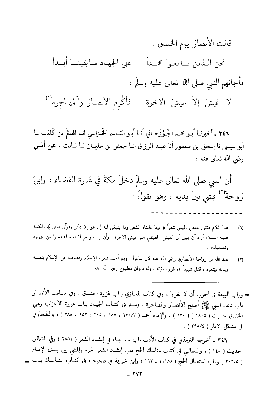 346 - أَخْبَرَنَا أَبُو مُحَمَّدٍ الْجُوزَجَانِيُّ أَنَا أَبُو الْقَاسِمِ الْخُزَاعِيُّ أَنَا الْهَيْثَمُ بْنُ كُلَيْبٍ نا أَبُو عيسى نا إسحق بْنُ مَنْصُورٍ أَنَا عَبْدُ الرَّزَّاقِ أَنَا جَعْفَرُ بْنُ سُلَيْمَانَ نا ثَابِتٌ عَنْ أَنَسٍ رَضِيَ اللَّهُ تَعَالَى عَنْهُ أَنَّ النَّبِيَّ صَلَّى اللَّهُ تَعَالَى عَلَيْهِ وَسَلَّمَ دَخَلَ مَكَّةَ فِي عُمْرَةِ الْقَضَاءِ وَابْنُ رَوَاحَةَ يَمْشِي بَيْنَ يَدَيْهِ وَهُوَ يَقُولُ: