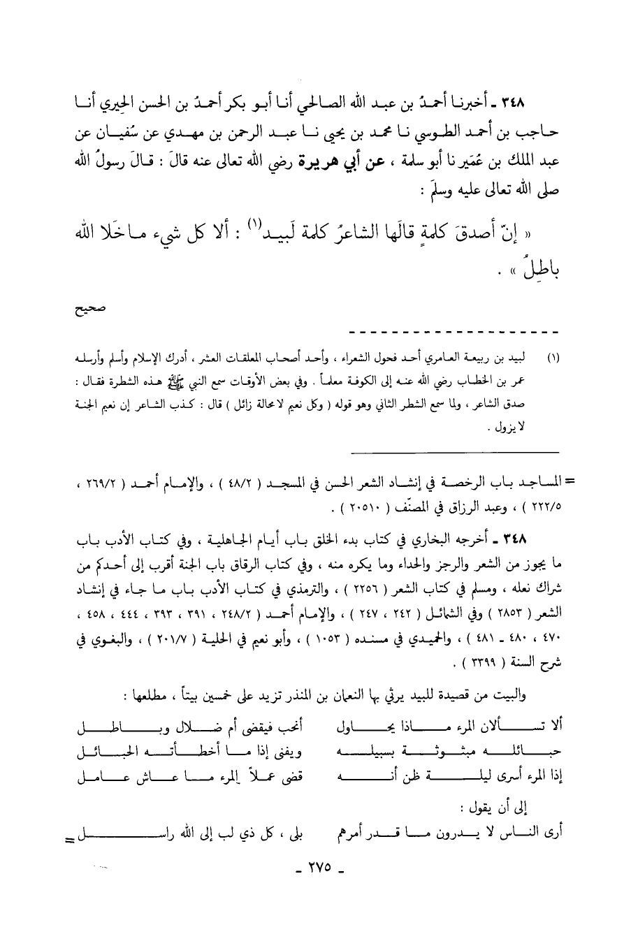 348 - أَخْبَرَنَا أَحْمَدُ بْنُ عَبْدِ اللَّهِ الصَّالِحِيُّ أَنَا أَبُو بَكْرٍ أَحْمَدُ بْنُ الْحَسَنِ الْحِيرِيُّ أَنَا حَاجِبُ بْنُ أَحْمَدَ الطُّوسِيُّ نا مُحَمَّدُ بْنُ يَحْيَى نا عَبْدُ الرَّحْمَنِ بْنُ مَهْدِيٍّ عَنْ سُفْيَانَ عَنْ عَبْدِ الْمَلِكِ بْنِ عُمَيْرٍ نا أَبُو سَلَمَةَ عَنْ أَبِي هُرَيْرَةَ رَضِيَ اللَّهُ تَعَالَى عَنْهُ قَالَ قَالَ رَسُولُ اللَّهِ صَلَّى اللَّهُ تَعَالَى عَلَيْهِ وَسَلَّمَ إِنَّ أَصْدَقَ كَلِمَةٍ قَالَهَا الشَّاعِرُ كَلِمَةُ لَبِيدٍ أَلا كُلُّ شَيْءٍ مَا خَلا الله باطل. صحيح
