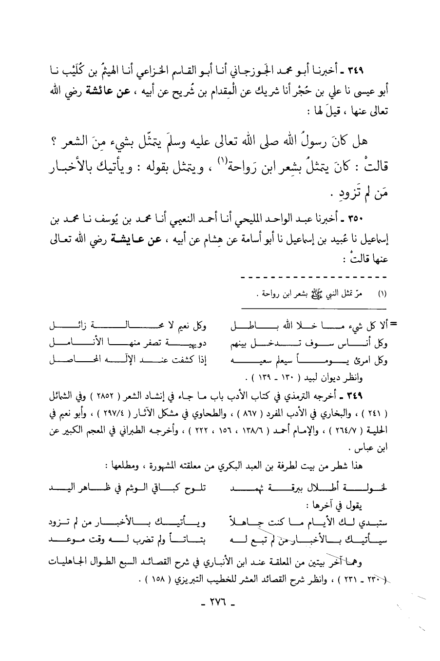 349 - أَخْبَرَنَا أَبُو مُحَمَّدٍ الْجُوزَجَانِيُّ أَنَا أَبُو الْقَاسِمِ الْخُزَاعِيُّ أَنَا الْهَيْثَمُ بْنُ كُلَيْبٍ نا أَبُو عِيسَى نا عَلِيُّ بْنُ حُجْرٍ أَنَا شَرِيكٌ عَنِ الْمِقْدَامِ بْنِ شُرَيْحٍ عَنْ أَبِيهِ عَنْ عَائِشَةَ رَضِيَ اللَّهُ تَعَالَى عَنْهَا قِيلَ لَهَا هَلْ كَانَ رَسُولُ اللَّهِ صَلَّى اللَّهُ تَعَالَى عَلَيْهِ وَسَلَّمَ يَتَمَثَّلُ بِشَيْءٍ مِنَ الشِّعْرِ قَالَتْ كَانَ يَتَمَثَّلُ بِشِعْرِ ابْنِ رَوَاحَةَ وَيَتَمَثَّلُ بِقَوْلِهِ وَيَأْتِيكَ بِالأَخْبَارِ مَنْ لَمْ تُزَوِّدِ.