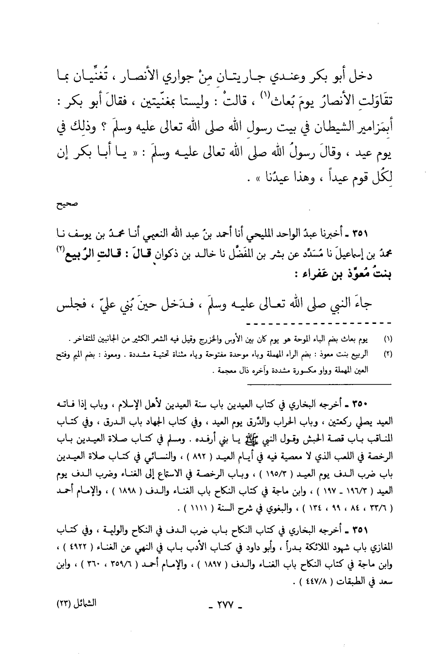 دَخَلَ أَبُو بَكْرٍ وَعِنْدِي جَارِيَتَانِ مِنْ جَوَارِي الأَنْصَارِ تُغَنِّيَانِ بِمَا تَقَاوَلَتِ الأَنْصَارُ يَوْمَ بُعَاثٍ قَالَتْ وَلَيْسَتَا بِمُغَنِّيَتَيْنِ فَقَالَ أَبُو بَكْرٍ أَبِمَزَامِيرِ الشَّيْطَانِ فِي بَيْتِ رَسُولِ اللَّهِ صَلَّى اللَّهُ تَعَالَى عَلَيْهِ وَسَلَّمَ وَذَلِكَ فِي يَوْمِ عِيدٍ وَقَالَ رَسُولُ اللَّهِ صَلَّى اللَّهُ تَعَالَى عَلَيْهِ وَسَلَّمَ يَا أَبَا بَكْرٍ إِنَّ لِكُلِّ قَوْمٍ عِيدًا وهذا عيدنا. صحيح