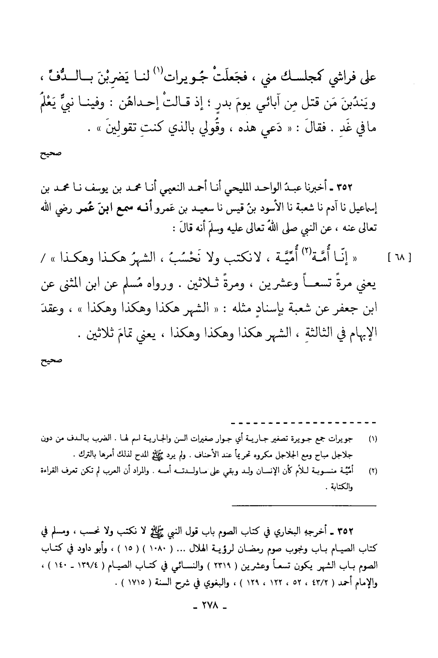 352 - أَخْبَرَنَا عَبْدُ الْوَاحِدِ الْمَلِيحِيُّ أَنَا أَحْمَدُ النُّعَيْمِيُّ أَنَا مُحَمَّدُ بْنُ يُوسُفَ نا مُحَمَّدُ بْنُ إِسْمَاعِيلَ نا آدَمُ نا شُعْبَةُ نا الأَسْوَدُ بْنُ قَيْسٍ نا سَعِيدُ بْنُ عَمْرٍو أَنَّهُ سَمِعَ ابْنَ عُمَرَ رَضِيَ اللَّهُ تَعَالَى عَنْهُ عَنِ النَّبِيِّ صَلَّى اللَّهُ تَعَالَى عَلَيْهِ وَسَلَّمَ قَالَ إِنَّا أُمَّةٌ أُمِّيَّةٌ لا نَكْتُبُ وَلا نَحْسِبُ الشَّهْرُ هَكَذَا وَهَكَذَا يَعْنِي مَرَّةً تِسْعًا وَعِشْرِينَ وَمَرَّةً ثَلاثِينَ وَرَوَاهُ مُسْلِمٌ عَنِ ابْنِ الْمُثَنَّى عَنِ ابْنِ جَعْفَرٍ عَنْ شُعْبَةَ بِإِسْنَادٍ مِثْلَهُ الشَّهْرُ هَكَذَا وَهَكَذَا وَهَكَذَا وَعَقَدَ الإِبْهَامَ فِي الثَّالِثَةِ الشَّهْرُ هَكَذَا وَهَكَذَا وَهَكَذَا يَعْنِي تمام ثلاثين. صحيح
