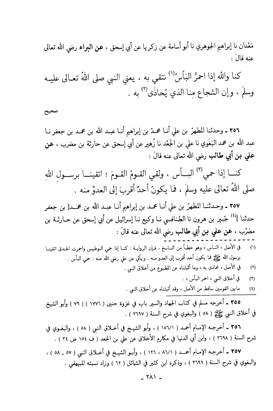 356 - وَحَدَّثَنَا الْمُطَهَّرُ بْنُ عَلِيٍّ أَنَا مُحَمَّدُ بْنُ إِبْرَاهِيمَ أَنَا عَبْدُ اللَّهِ بْنُ مُحَمَّدِ بْنِ جَعْفَرٍ نا عَبْدُ الله بن محمود الْبَغَوِيُّ نا عَلِيُّ بْنُ الْجَعْدِ نا زُهَيْرٌ عن أبي إسحق عَنْ حَارِثَةَ بْنِ مُضَرِّبٍ عَنْ عَلِيِّ بْنِ أَبِي طَالِبٍ رَضِيَ اللَّهُ تَعَالَى عَنْهُ قَالَ: كُنَّا إِذَا حَمِيَ الْبَأْسُ وَلَقِيَ الْقَوْمُ الْقَوْمَ اتَّقَيْنَا بِرَسُولِ اللَّهِ صَلَّى اللَّهُ تَعَالَى عَلَيْهِ وَسَلَّمَ فَمَا يَكُونُ أَحَدٌ أَقْرَبَ إِلَى الْعَدُوِّ مِنْهُ.