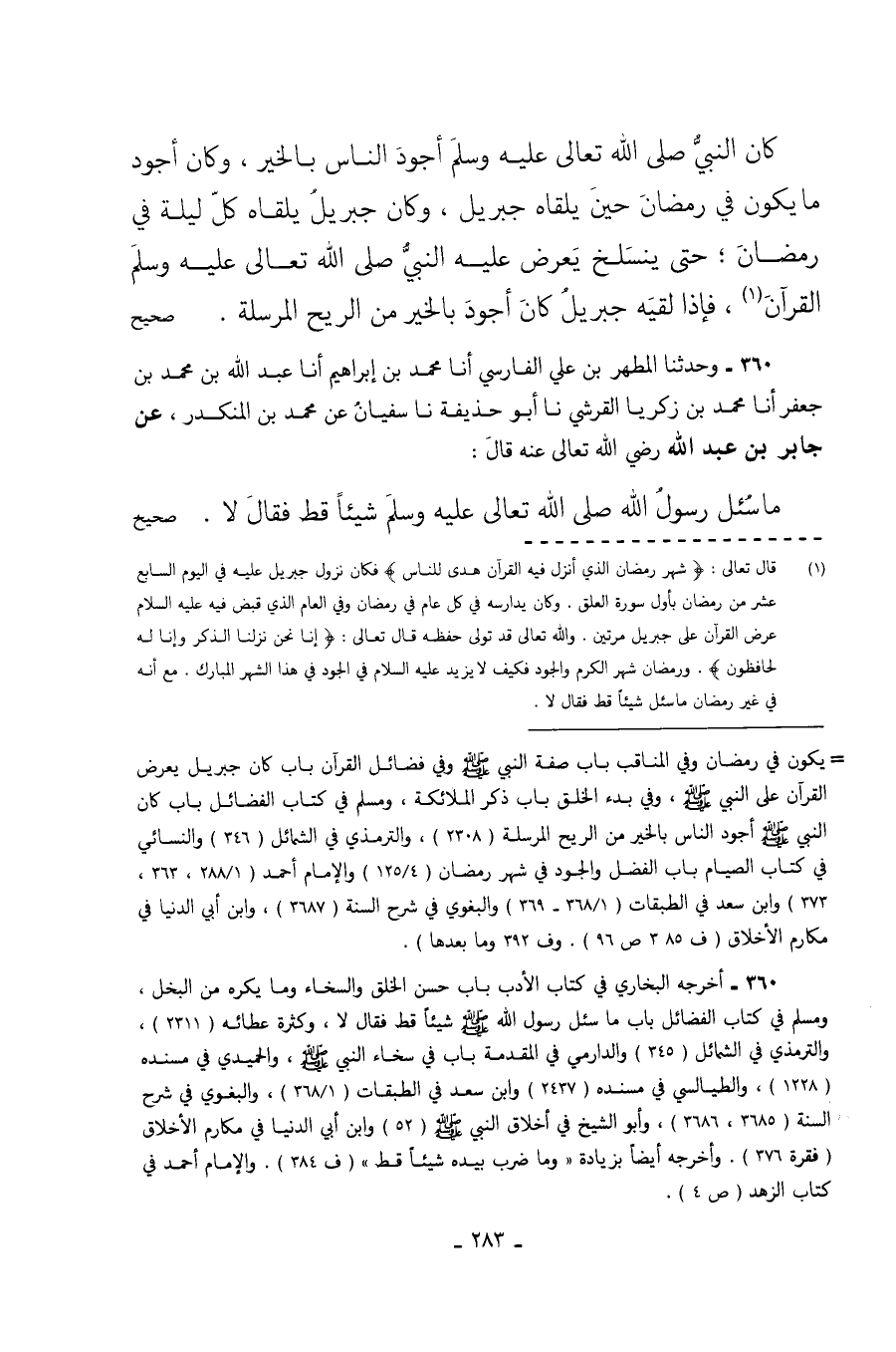 360 - وَحَدَّثَنَا الْمُطَهَّرُ بْنُ عَلِيٍّ الْفَارِسِيُّ أَنَا مُحَمَّدُ بْنُ إِبْرَاهِيمَ أَنَا عَبْدُ اللَّهِ بْنُ مُحَمَّدِ بْنِ جَعْفَرٍ أَنَا مُحَمَّدُ بْنُ زَكَرِيَّا الْقُرَشِيُّ نا أَبُو حُذَيْفَةَ نا سُفْيَانُ عَنْ مُحَمَّدِ بْنِ الْمُنْكَدِرِ عَنْ جَابِرِ بْنِ عَبْدِ اللَّهِ رَضِيَ اللَّهُ تَعَالَى عَنْهُ قَالَ مَا سُئِلَ رَسُولُ اللَّهِ صَلَّى اللَّهُ تَعَالَى عَلَيْهِ وَسَلَّمَ شَيْئًا قَطُّ فقال لا. صحيح