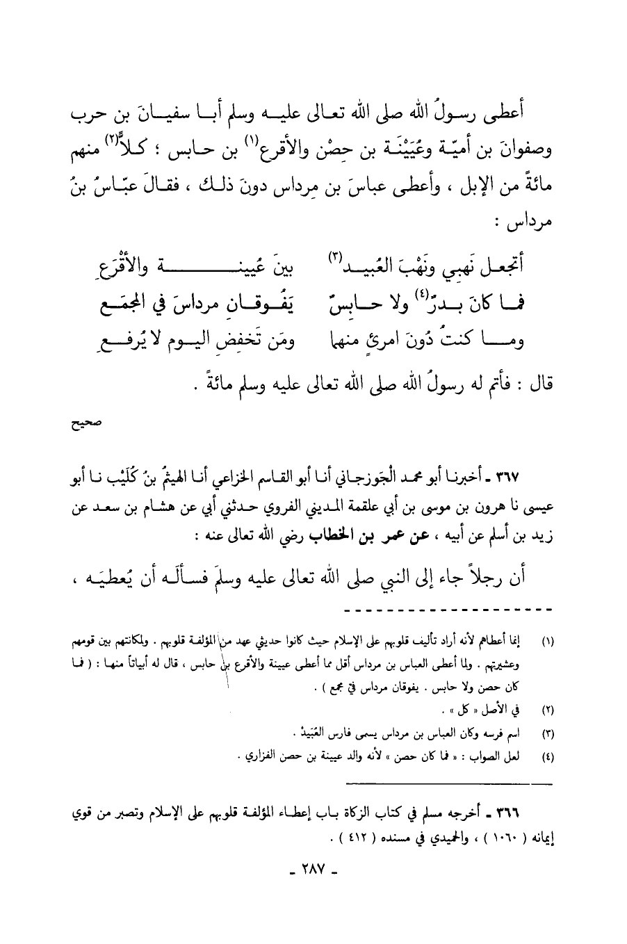 أَعْطَى رَسُولُ اللَّهِ صَلَّى اللَّهُ تَعَالَى عَلَيْهِ وَسَلَّمَ أَبَا سُفْيَانَ بْنَ حَرْبٍ وَصَفْوَانَ بْنَ أُمَيَّةَ وَعُيَيْنَةَ بْنَ حِصْنٍ وَالأَقْرَعَ بْنَ حَابِسٍ كُلا مِنْهُمْ مِائَةً مِنَ الإِبِلِ وَأَعْطَى عَبَّاسَ بْنَ مِرْدَاسٍ دُونَ ذَلِكَ فَقَالَ عَبَّاسُ بْنُ مِرْدَاسٍ أَتَجْعَلُ نَهْبِي وَنَهْبَ الْعَبِيدِ بَيْنَ عُيَيْنَةَ وَالأَقْرَعِ فَمَا كَانَ بَدْرٌ وَلا حَابِسٌ يَفُوقَانِ مِرْدَاسَ فِي الْمَجْمَعِ وَمَا كُنْتُ دُونَ امْرِئٍ مِنْهُمَا وَمَنْ تَخْفِضِ الْيَوْمَ لا يُرْفَعِ قَالَ فَأَتَمَّ لَهُ رَسُولُ اللَّهِ صَلَّى اللَّهُ تَعَالَى عَلَيْهِ وسلم مائة. صحيح