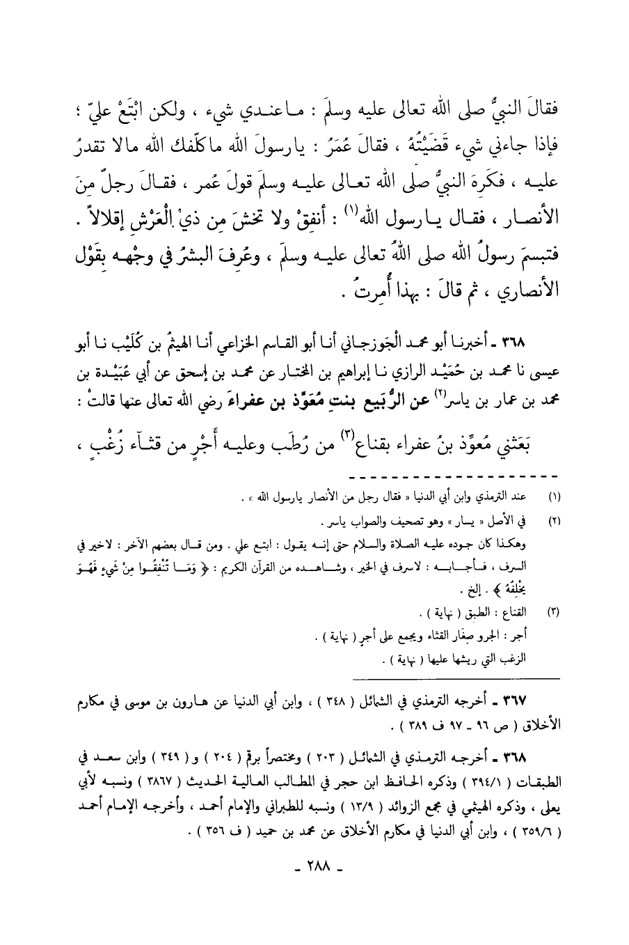 368 - أَخْبَرَنَا أَبُو مُحَمَّدٍ الْجُوزَجَانِيُّ أَنَا أَبُو الْقَاسِمِ الْخُزَاعِيُّ أَنَا الْهَيْثَمُ بْنُ كُلَيْبٍ نا أَبُو عِيسَى نا مُحَمَّدُ بْنُ حُمَيْدٍ الرَّازِيُّ نا إِبْرَاهِيمُ بْنُ الْمُخْتَارِ عَنْ محمد بن إسحق عَنْ أَبِي عُبَيْدَةَ بْنِ مُحَمَّدِ بْنِ عَمَّارِ بْنِ يَاسِرٍ عَنْ الرُّبَيِّعِ بِنْتِ مُعَوِّذِ بْنِ عَفْرَاءَ رَضِيَ اللَّهُ تَعَالَى عَنْهَا قَالَتْ بَعَثَنِي مُعَوِّذُ بْنُ عَفْرَاءَ بِقِنَاعٍ مِنْ رُطَبٍ وَعَلَيْهِ أَجْرٌ مِنْ قِثَّاءٍ زُغْبٍ،