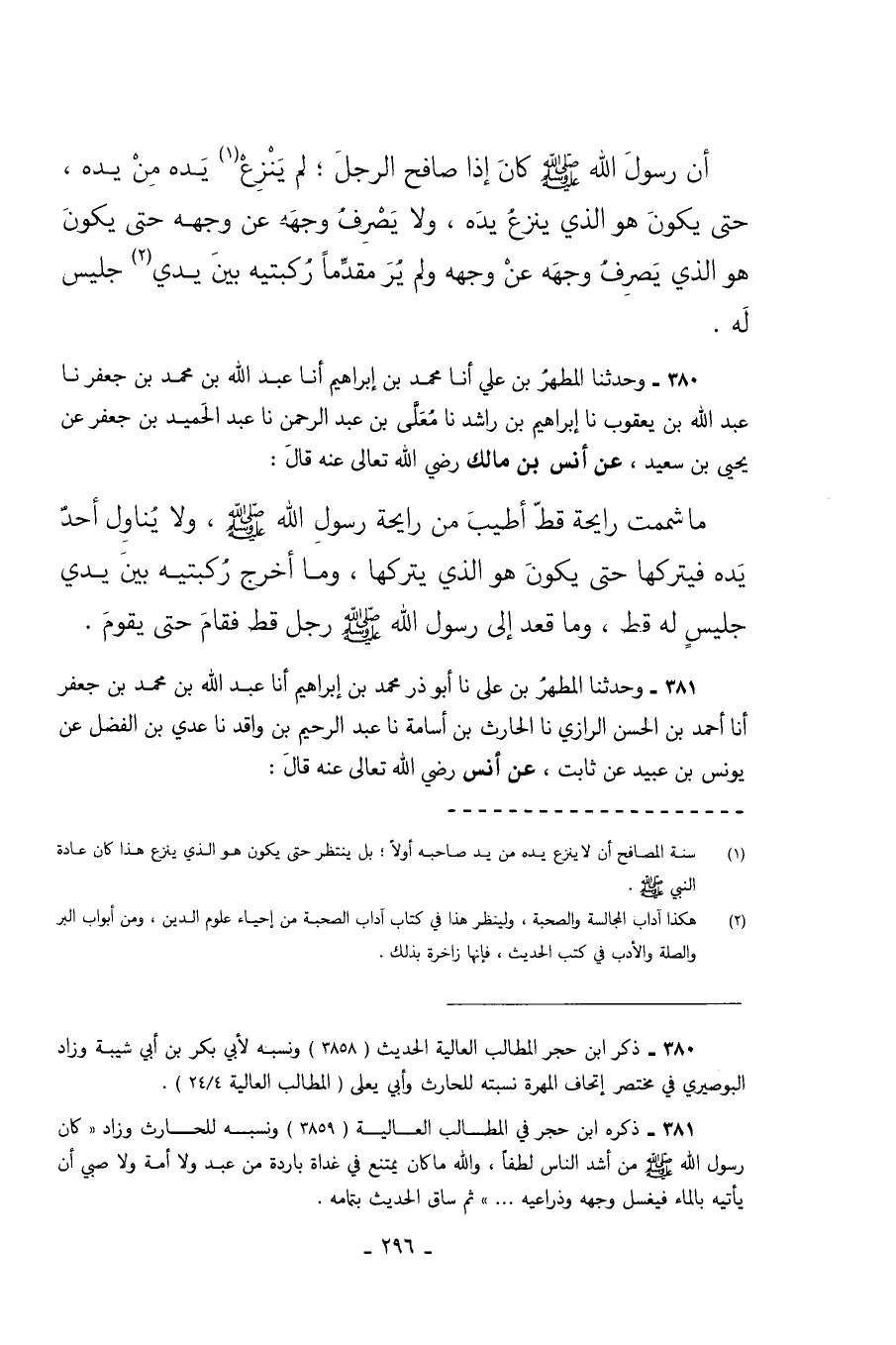 380 - وَحَدَّثَنَا الْمُطَهَّرُ بْنُ عَلِيٍّ أَنَا مُحَمَّدُ بْنُ إِبْرَاهِيمَ أَنَا عَبْدُ اللَّهِ بْنُ مُحَمَّدِ بْنِ جَعْفَرٍ نا عَبْدُ اللَّهِ بْنُ يَعْقُوبَ نا إِبْرَاهِيمُ بْنُ رَاشِدٍ نا مُعَلَّى بْنُ عَبْدِ الرَّحْمَنِ نا عَبْدُ الْحَمِيدِ بْنُ جَعْفَرٍ عَنْ يَحْيَى بْنِ سَعِيدٍ عَنْ أَنَسِ بْنِ مَالِكٍ رَضِيَ اللَّهُ تَعَالَى عَنْهُ قَالَ مَا شَمَمْتُ رَايِحَةً قَطُّ أَطْيَبَ مِنْ رَايِحَةِ رَسُولِ اللَّهِ صَلَّى اللهُ عَلَيْهِ وَسَلَّمَ وَلا يُنَاوِلُ أَحَدٌ يَدَهُ فَيَتْرُكُهَا حَتَّى يَكُونَ هُوَ الَّذِي يَتْرُكُهَا وَمَا أَخْرَجَ رُكْبَتَيْهِ بَيْنَ يَدَيْ جَلِيسٍ لَهُ قَطُّ وَمَا قَعَدَ إِلَى رَسُولِ اللَّهِ صَلَّى اللهُ عَلَيْهِ وَسَلَّمَ رَجُلٌ قَطُّ فَقَامَ حَتَّى يَقُومَ.