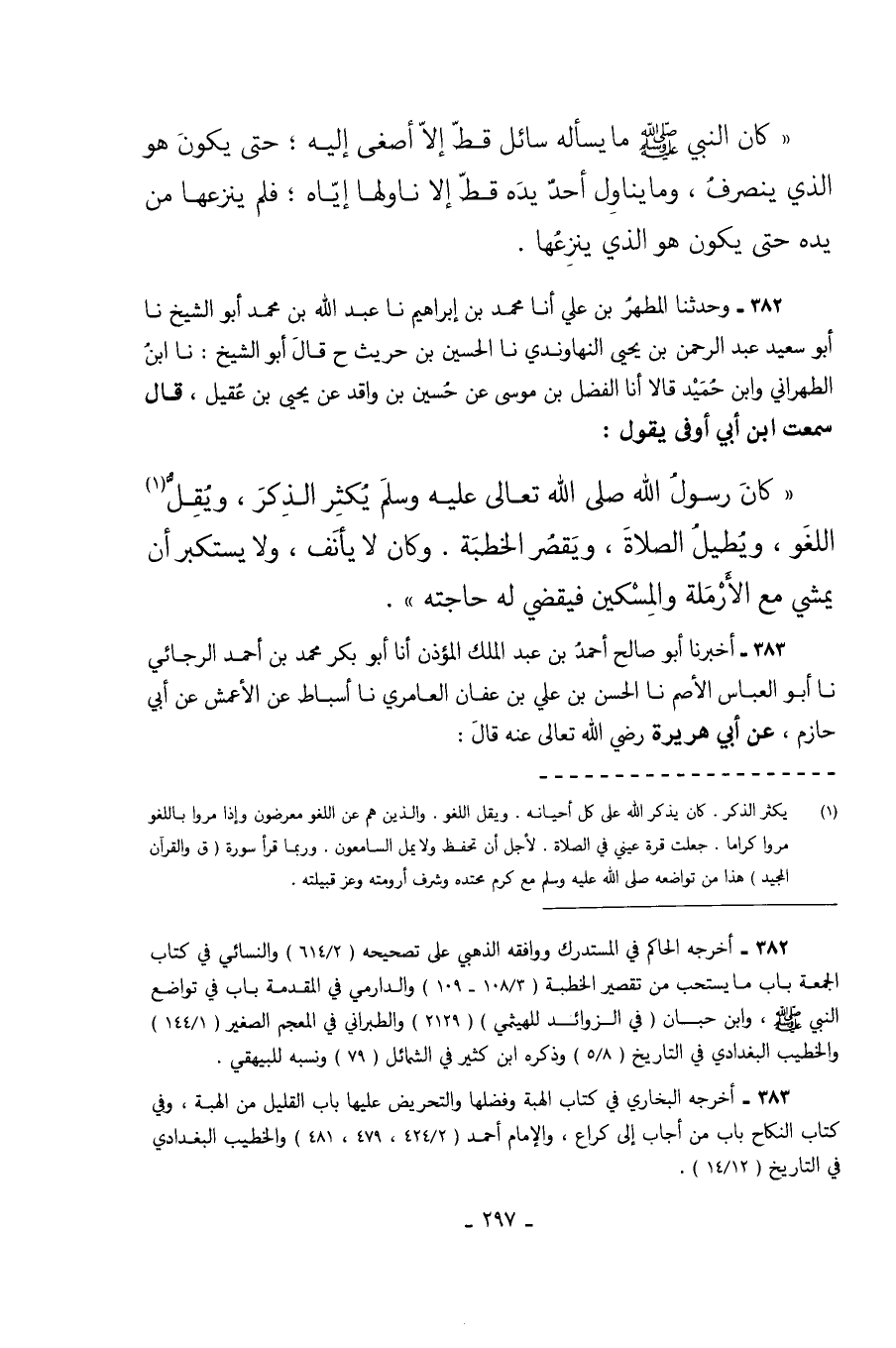 382 - وَحَدَّثَنَا الْمُطَهَّرُ بْنُ عَلِيٍّ أَنَا مُحَمَّدُ بْنُ إِبْرَاهِيمَ نا عَبْدُ اللَّهِ بْنُ مُحَمَّدٍ أَبُو الشَّيْخِ نا أَبُو سَعِيدٍ عَبْدُ الرَّحْمَنِ بْنُ يَحْيَى النُّهَاوَنْدِيُّ نا الْحُسَيْنُ بْنُ حُرَيْثٍ ح قَالَ أَبُو الشَّيْخِ نا ابْنُ الطِّهْرَانِيِّ وَابْنُ حُمَيْدٍ قَالا أَنَا الْفَضْلُ بْنُ مُوسَى عَنْ حُسَيْنِ بْنِ وَاقِدٍ عَنْ يَحْيَى بْنِ عَقِيلٍ قَالَ سَمِعْتُ ابْنَ أَبِي أَوْفَى يَقُولُ كَانَ رَسُولُ اللَّهِ صَلَّى اللهُ عَلَيْهِ وَسَلَّمَ يُكْثِرُ الذِّكْرَ وَيُقِلُّ اللَّغْوَ وَيُطِيلُ الصَّلاةَ وَيَقْصُرُ الْخُطْبَةَ وَكَانَ لا يَأْنَفُ وَلا يَسْتَكْبِرُ أَنْ يَمْشِيَ مَعَ الأَرْمَلَةِ وَالْمِسْكِينِ فَيَقْضِيَ لَهُ حَاجَتَهُ.