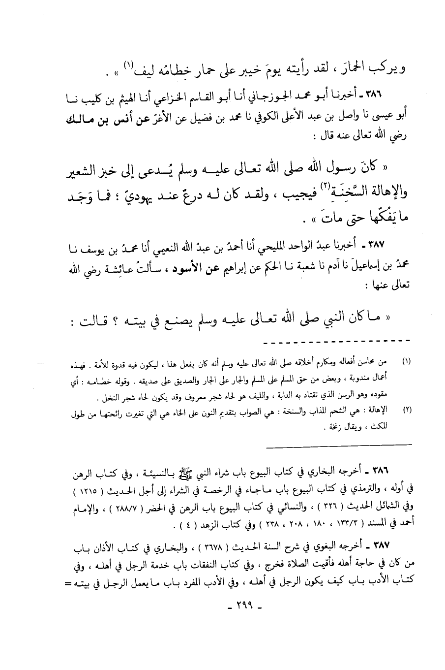 386 - أَخْبَرَنَا أَبُو مُحَمَّدٍ الْجُوزَجَانِيُّ أَنَا أَبُو الْقَاسِمِ الْخُزَاعِيُّ أَنَا الْهَيْثَمُ بْنُ كُلَيْبٍ نا أَبُو عِيسَى نا وَاصِلُ بْنُ عَبْدِ الأَعْلَى الْكُوفِيُّ نا مُحَمَّدُ بْنُ فضيل عن الأغر عَنِ أَنَسِ بْنِ مَالِكٍ رَضِيَ اللَّهُ تَعَالَى عَنْهُ قَالَ كَانَ رَسُولُ اللَّهِ صَلَّى اللهُ عَلَيْهِ وَسَلَّمَ يُدْعَى إِلَى خُبْزِ الشَّعِيرِ وَالإِهَالَةِ السَّخِنَةِ فَيُجِيبُ وَلَقَدْ كَانَ لَهُ دِرْعٌ عِنْدَ يَهُودِيٍّ فَمَا وَجَدَ مَا يَفُكُّهَا حَتَّى مَاتَ.