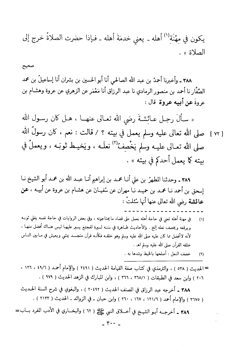 388 - وَأَخْبَرَنَا أَحْمَدُ بْنُ عَبْدِ اللَّهِ الصَّالِحِيُّ أَنَا أَبُو الْحُسَيْنِ بْنُ بِشْرَانَ أَنَا إِسْمَاعِيلُ بْنُ مُحَمَّدٍ الصَّفَّارُ نا أَحْمَدُ بْنُ مَنْصُورٍ الرَّمَادِيُّ نا عَبْدُ الرَّزَّاقِ أَنَا مَعْمَرٌ عَنِ الزُّهْرِيِّ عَنْ عُرْوَةَ وَهِشَامِ بْنِ عُرْوَةَ عَنْ أَبِيهِ عُرْوَةَ قَالَ سَأَلَ رَجُلٌ عَائِشَةَ رَضِيَ اللَّهُ تَعَالَى عَنْهَا هَلْ كَانَ رَسُولُ اللَّهِ صَلَّى اللَّهُ تَعَالَى عَلَيْهِ وَسَلَّمَ يَعْمَلُ فِي بَيْتِهِ قَالَتْ نَعَمْ كَانَ رَسُولُ اللَّهِ صَلَّى اللَّهُ تَعَالَى عَلَيْهِ وَسَلَّمَ يَخْصِفُ نَعْلَهُ وَيُخَيِّطُ ثَوْبَهُ وَيَعْمَلُ فِي بَيْتِهِ كَمَا يَعْمَلُ أَحَدُكُمْ فِي بَيْتِهِ.