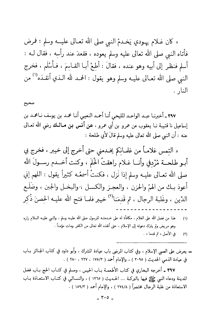 397 - أَخْبَرَنَا عَبْدُ الْوَاحِدِ الْمَلِيحِيُّ أَنَا أَحْمَدُ النُّعَيْمِيُّ أَنَا مُحَمَّدُ بْنُ يُوسُفَ نا مُحَمَّدُ بْنُ إِسْمَاعِيلَ نا قُتَيْبَةُ نا يَعْقُوبُ عَنْ عَمْرِو بْنِ أَبِي عَمْرٍو عَنْ أَنَسِ بْنِ مَالِكٍ رَضِيَ اللَّهُ تَعَالَى عَنْهُ أَنَّ النَّبِيَّ صَلَّى اللَّهُ تَعَالَى عَلَيْهِ وَسَلَّمَ قَالَ لأَبِي طَلْحَةَ الْتَمِسْ غُلامًا مِنْ غِلْمَانِكُمْ يَخْدُمُنِي حَتَّى أَخْرُجَ إِلَى خَيْبَرَ فَخَرَجَ بِي أَبُو طَلْحَةَ مُرْدِفِي وَأَنَا غُلامٌ رَاهَقْتُ الْحُلُمَ وَكُنْتُ أَخْدُمُ رَسُولَ اللَّهِ صَلَّى اللَّهُ تَعَالَى عَلَيْهِ وَسَلَّمَ إِذَا نَزَلَ فَكُنْتُ أَسْمَعُهُ كَثِيرًا يَقُولُ اللَّهُمَّ إِنِّي أَعُوذُ بِكَ مِنَ الْهَمِّ وَالْحَزَنِ وَالْعَجْزِ وَالْكَسَلِ وَالْبُخْلِ وَالْجُبْنِ وَضَلَعِ الدَّيْنِ وَغَلَبَةِ الرِّجَالِ ثُمَّ قَدِمْنَا خَيْبَرَ فَلَمَّا فَتَحَ اللَّهُ عَلَيْهِ الْحِصْنَ ذُكِرَ