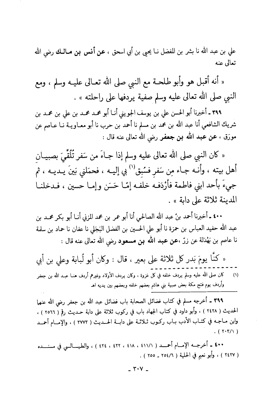 399 - أَخْبَرَنَا أَبُو الْحَسَنِ عَلِيُّ بْنُ يُوسُفَ الْجُوَيْنِيُّ أَنَا أَبُو مُحَمَّدٍ مُحَمَّدُ بْنُ عَلِيِّ بْنِ مُحَمَّدِ بْنِ شَرِيكٍ الشَّافِعِيُّ أَنَا عَبْدُ اللَّهِ بْنُ مُحَمَّدِ بْنِ مُسْلِمٍ نا أَحْمَدُ بْنُ حرب نا أبو معاوية نا عَاصِمٌ عَنْ مُوَرِّقٍ عَنْ عَبْدِ اللَّهِ بْنِ جَعْفَرٍ رَضِيَ اللَّهُ تَعَالَى عَنْهُ قَالَ كَانَ النَّبِيُّ صَلَّى اللَّهُ تَعَالَى عَلَيْهِ وَسَلَّمَ إِذَا جَاءَ مِنْ سَفَرٍ تُلُقِّيَ بِصِبْيَانِ أَهْلِ بَيْتِهِ وَأَنَّهُ جَاءَ مِنْ سَفَرٍ فَسُبِقَ بِي إِلَيْهِ فَحَمَلَنِي بَيْنَ يَدَيْهِ ثُمَّ جِيءَ بِأَحَدِ ابْنَيْ فَاطِمَةَ فَأَرْدَفَهُ خَلْفَهُ إِمَّا حَسَنٌ وَإِمَّا حُسَيْنٌ فَدَخَلْنَا الْمَدِينَةَ ثَلاثَةً عَلَى دَابَّةٍ.