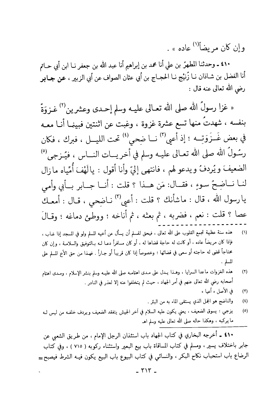 410 - وَحَدَّثَنَا الْمُطَهَّرُ بْنُ عَلِيٍّ أَنَا مُحَمَّدُ بْنُ إِبْرَاهِيمَ أَنَا عَبْدُ اللَّهِ بْنُ جَعْفَرٍ نا ابْنُ أَبِي حَاتِمٍ أَنَا الْفَضْلُ بْنُ شَاذَانَ نا زُنَيْجٌ نا الْحَجَّاجُ بْنُ أَبِي عُثْمَانَ الصَّوَّافُ عَنْ أَبِي الزُّبَيْرِ عَنْ جَابِرٍ رَضِيَ اللَّهُ تَعَالَى عَنْهُ قَالَ غَزَا رَسُولُ اللَّهِ صَلَّى اللَّهُ تَعَالَى عَلَيْهِ وَسَلَّمَ إِحْدَى وَعِشْرِينَ غَزْوَةً بِنَفْسِهِ شَهِدْتُ مِنْهَا تِسْعَ عَشْرَةَ غَزْوَةً وَغِبْتُ عَنِ اثْنَتَيْنِ فَبَيْنَمَا أَنَا مَعَهُ في بعض غزوته إِذْ أَعْيَى نَاضِحِي تَحْتَ اللَّيْلِ فَبَرَكَ فَكَانَ رَسُولُ اللَّهِ صَلَّى اللَّهُ تَعَالَى عَلَيْهِ وَسَلَّمَ فِي أُخْرَيَاتِ النَّاسِ فَيُزْجِي الضَّعِيفَ وَيُرْدِفُ وَيَدْعُو لَهُمْ فَانْتَهَى إِلَيَّ وَأَنَا أَقُولُ يَا لَهْفَ أُمَيَّاهُ مَا زَالَ لَنَا نَاضِحُ سُوءٍ فَقَالَ مَنْ هَذَا قُلْتُ أَنَا جَابِرٌ بِأَبِي وَأُمِّي يَا رَسُولَ اللَّهِ قَالَ مَا شَأْنُكَ قُلْتُ أَعْيَى نَاضِحِي قَالَ أَمَعَكَ عَصًا قُلْتُ نَعَمْ فَضَرَبَهُ ثُمَّ بَعَثَهُ ثُمَّ أَنَاخَهُ وَوَطِئَ دِمَاغَهُ وَقَالَ