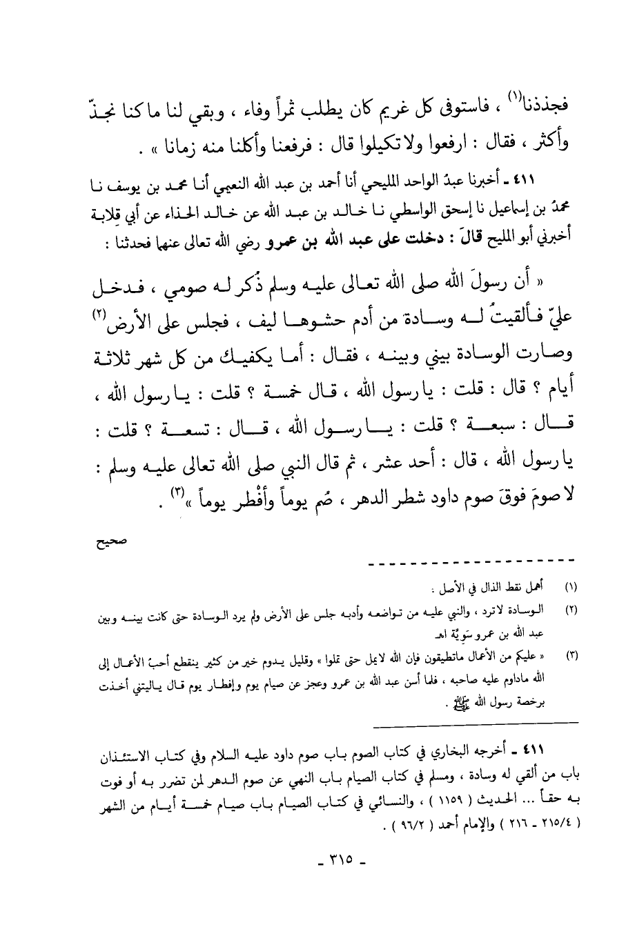 411 - أَخْبَرَنَا عَبْدُ الْوَاحِدِ الْمَلِيحِيُّ أَنَا أَحْمَدُ بْنُ عَبْدِ اللَّهِ النُّعَيْمِيُّ أَنَا مُحَمَّدُ بْنُ يُوسُفَ نا مُحَمَّدُ بْنُ إسماعيل نا إسحق الْوَاسِطِيُّ نا خَالِدُ بْنُ عَبْدِ اللَّهِ عَنْ خَالِدٍ الْحَذَّاءِ عَنْ أَبِي قِلابَةَ أَخْبَرَنِي أَبُو الْمَلِيحِ قَالَ دَخَلْتُ عَلَى عَبْدِ اللَّهِ بْنِ عَمْرٍو رَضِيَ اللَّهُ تَعَالَى عَنْهُمَا فَحَدَّثَنَا أَنَّ رَسُولَ اللَّهِ صَلَّى اللَّهُ تَعَالَى عَلَيْهِ وَسَلَّمَ ذُكِرَ لَهُ صَوْمِي فَدَخَلَ عَلَيَّ فَأَلْقَيْتُ لَهُ وِسَادَةً مِنْ أُدْمٍ حَشْوُهَا لِيفٌ فَجَلَسَ عَلَى الأَرْضِ وَصَارَتِ الْوِسَادَةُ بَيْنِي وَبَيْنَهُ فَقَالَ أَمَا يَكْفِيكَ مِنْ كُلِّ شَهْرٍ ثَلاثَةُ أَيَّامٍ قَالَ قُلْتُ يَا رَسُولَ اللَّهِ قَالَ خَمْسَةٌ قُلْتُ يَا رَسُولَ اللَّهِ قَالَ سَبْعَةٌ قُلْتُ يَا رَسُولَ اللَّهِ قَالَ تِسْعَةٌ قُلْتُ يَا رَسُولَ اللَّهِ قَالَ أَحَدَ عَشَرَ ثُمَّ قَالَ النَّبِيُّ صَلَّى اللَّهُ تَعَالَى عَلَيْهِ وَسَلَّمَ لا صَوْمَ فَوْقَ صَوْمِ دَاوُدَ شَطْرَ الدَّهْرِ صُمْ يَوْمًا وأفطر يوما. صحيح