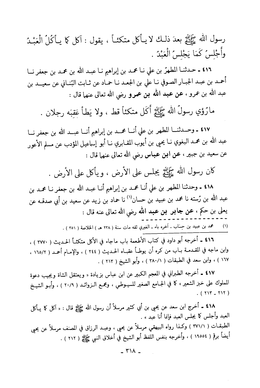 416 - حَدَّثَنَا الْمُطَهَّرُ بْنُ عَلِيٍّ نا مُحَمَّدُ بْنُ إِبْرَاهِيمَ نا عَبْدُ اللَّهِ بْنُ مُحَمَّدِ بْنِ جَعْفَرٍ نا أَحْمَدُ بْنُ عَبْدِ الْجَبَّارِ الصُّوفِيُّ نا عَلِيُّ بْنُ الْجَعْدِ نا حَمَّادٌ عَنْ ثَابِتٍ الْبُنَانِيِّ عَنْ سَعِيدِ بْنِ عَبْدِ اللَّهِ بْنِ عَمْرٍو عَنْ عَبْدِ اللَّهِ بْنِ عَمْرٍو رَضِيَ اللَّهُ تَعَالَى عَنْهُمَا قَالَ مَا رُؤِيَ رَسُولُ اللَّهِ صَلَّى اللهُ عَلَيْهِ وَسَلَّمَ أَكَلَ مُتَّكِئًا قَطُّ وَلا يَطَأُ عَقِبَهُ رَجُلانِ.