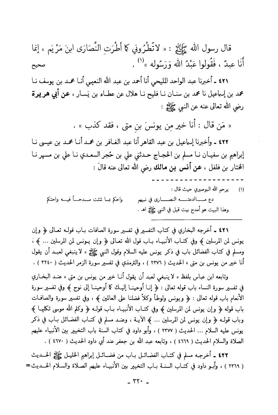 قَالَ رسول الله صَلَّى اللهُ عَلَيْهِ وَسَلَّمَ لاتطروني كَمَا أَطْرَتِ النَّصَارَى ابْنَ مَرْيَمَ إِنَّمَا أَنَا عَبْدٌ فَقُولُوا عَبْدَ الله ورسوله. صحيح