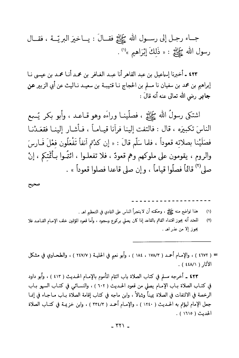 423 - أَخْبَرَنَا إِسْمَاعِيلُ بْنُ عَبْدِ الْقَاهِرِ أَنَا عَبْدُ الْغَافِرِ بْنُ مُحَمَّدٍ أَنَا مُحَمَّدُ بْنُ عِيسَى نا إِبْرَاهِيمُ بْنُ مُحَمَّدِ بْنِ سُفْيَانَ نا مُسْلِمُ بْنُ الْحَجَّاجِ نا قُتَيْبَةُ بْنُ سَعِيدٍ نا لَيْثٌ عَنْ أَبِي الزُّبَيْرِ عَنْ جَابِرٍ رَضِيَ اللَّهُ تَعَالَى عَنْهُ أَنَّهُ قَالَ اشْتَكَى رَسُولُ اللَّهِ صَلَّى اللهُ عَلَيْهِ وَسَلَّمَ فَصَلَّيْنَا وَرَاءَهُ وَهُوَ قَاعِدٌ وَأَبُو بَكْرٍ يُسْمِعُ النَّاسَ تَكْبِيرَهُ قَالَ فَالْتَفَتَ إِلَيْنَا فَرَآنَا قِيَامًا فَأَشَارَ إِلَيْنَا فَقَعَدْنَا فَصَلَّيْنَا بِصَلاتِهِ قُعُودًا فَلَمَّا سَلَّمَ قَالَ إِنْ كِدْتُمْ آنِفًا تَفْعَلُونَ فِعْلَ فَارِسٍ وَالرُّومِ يَقُومُونَ عَلَى مُلُوكِهِمْ وَهُمْ قُعُودٌ فَلا تَفْعَلُوا ائْتَمُّوا بِأَئِمَّتِكُمْ إِنْ صَلَّى قَائِمًا فَصَلُّوا قِيَامًا وَإِنْ صَلَّى قَاعِدًا فصلوا قعودا. صحيح