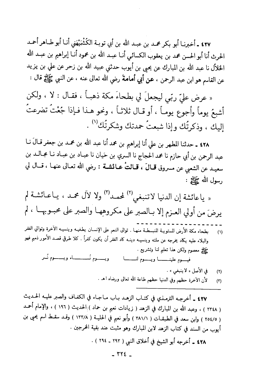 427 - أَخْبَرَنَا أَبُو بَكْرٍ مُحَمَّدُ بْنُ عَبْدِ اللَّهِ بْنِ أَبِي تَوْبَةَ الْكُشْمِيهَنِيُّ أَنَا أَبُو طاهر أحمد الحرث أَنَا أَبُو الْحَسَنِ مُحَمَّدُ بْنُ يَعْقُوبَ الْكِسَائِيُّ أَنَا عَبْدُ اللَّهِ بْنُ مَحْمُودٍ أَنَا إِبْرَاهِيمُ بْنُ عَبْدِ اللَّهِ الْخَلالُ نا عَبْدُ اللَّهِ بْنُ الْمُبَارَكِ عَنْ يَحْيَى بْنِ أَيُّوبَ حَدَّثَنِي عُبَيْدُ اللَّهِ بْنُ زَحْرٍ عَنْ عَلِيِّ بْنِ يَزِيدَ عَنِ الْقَاسِمِ هُوَ ابْنُ عَبْدِ الرَّحْمَنِ عَنْ أَبِي أُمَامَةَ رَضِيَ اللَّهُ تَعَالَى عَنْهُ عَنِ النَّبِيِّ صَلَّى اللهُ عَلَيْهِ وَسَلَّمَ قَالَ عَرَضَ عَلَيَّ رَبِّي لَيَجْعَلُ لِي بَطْحَاءَ مكة ذهبا فقال لا وَلَكِنْ أَشْبَعُ يَوْمًا وَأَجُوعُ يَوْمًا أَوْ قَالَ ثَلاثًا وَنَحْوَ هَذَا فَإِذَا جُعْتُ تَضَرَّعْتُ إِلَيْكَ وَذَكَرْتُكَ وَإِذَا شَبِعْتُ حَمِدْتُكَ وَشَكَرْتُكَ.