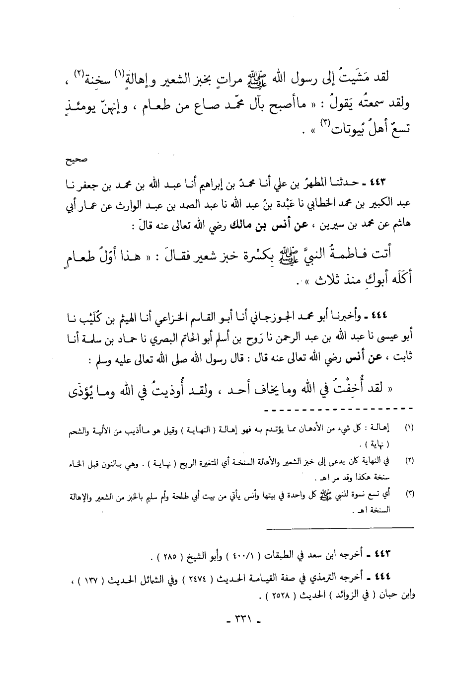 لَقَدْ مَشَيْتُ إِلَى رَسُولِ اللَّهِ صَلَّى اللهُ عَلَيْهِ وَسَلَّمَ مَرَّاتٍ بِخُبْزِ الشَّعِيرِ وَإِهَالَةٍ سَخِنَةٍ وَلَقَدْ سَمِعْتُهُ يَقُولُ مَا أَصْبَحَ بِآلِ مُحَمَّدٍ صَاعٌ مِنْ طَعَامٍ وَإِنَّهُنَّ يَوْمَئِذٍ تِسْعُ أهل بيوتات. صحيح