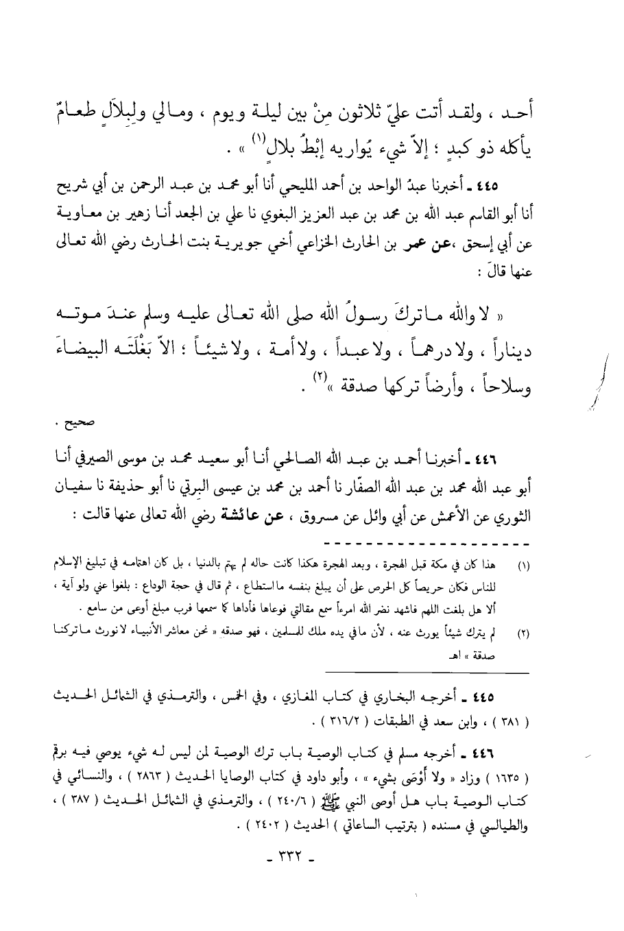 445 - أَخْبَرَنَا عَبْدُ الْوَاحِدِ بْنُ أَحْمَدَ الْمَلِيحِيُّ أَنَا أَبُو مُحَمَّدِ بْنُ عَبْدِ الرَّحْمَنِ بْنِ أَبِي شُرَيْحٍ أَنَا أَبُو الْقَاسِمِ عَبْدُ اللَّهِ بْنُ مُحَمَّدِ بْنِ عَبْدِ الْعَزِيزِ الْبَغَوِيُّ نا عَلِيُّ بْنُ الْجَعْدِ أَنَا زُهَيْرُ بْنُ مُعَاوِيَةَ عن أبي إسحق عن عمر بْنِ الْحَارِثِ الْخُزَاعِيِّ أَخِي جُوَيْرِيَةَ بِنْتِ الْحَارِثِ رَضِيَ اللَّهُ تَعَالَى عَنْهَا قَالَ لا وَاللَّهِ مَا تَرَكَ رَسُولُ اللَّهِ صَلَّى اللَّهُ تَعَالَى عَلَيْهِ وَسَلَّمَ عِنْدَ مَوْتِهِ دِينَارًا وَلا دِرْهَمًا وَلا عَبْدًا وَلا أَمَةً وَلا شَيْئًا إِلا بَغْلَتَهُ الْبَيْضَاءَ وَسِلاحًا وَأَرْضًا تركها صدقة. صحيح