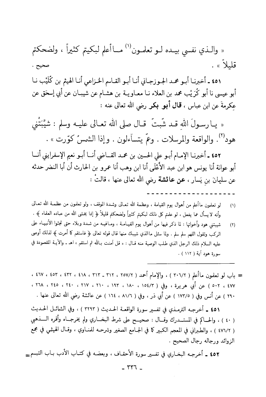 وَالَّذِي نَفْسِي بِيَدِهِ لَوْ تَعْلَمُونَ مَا أَعْلَمُ لَبَكَيْتُمْ كَثِيرًا ولضحكتم قليلا. صحيح