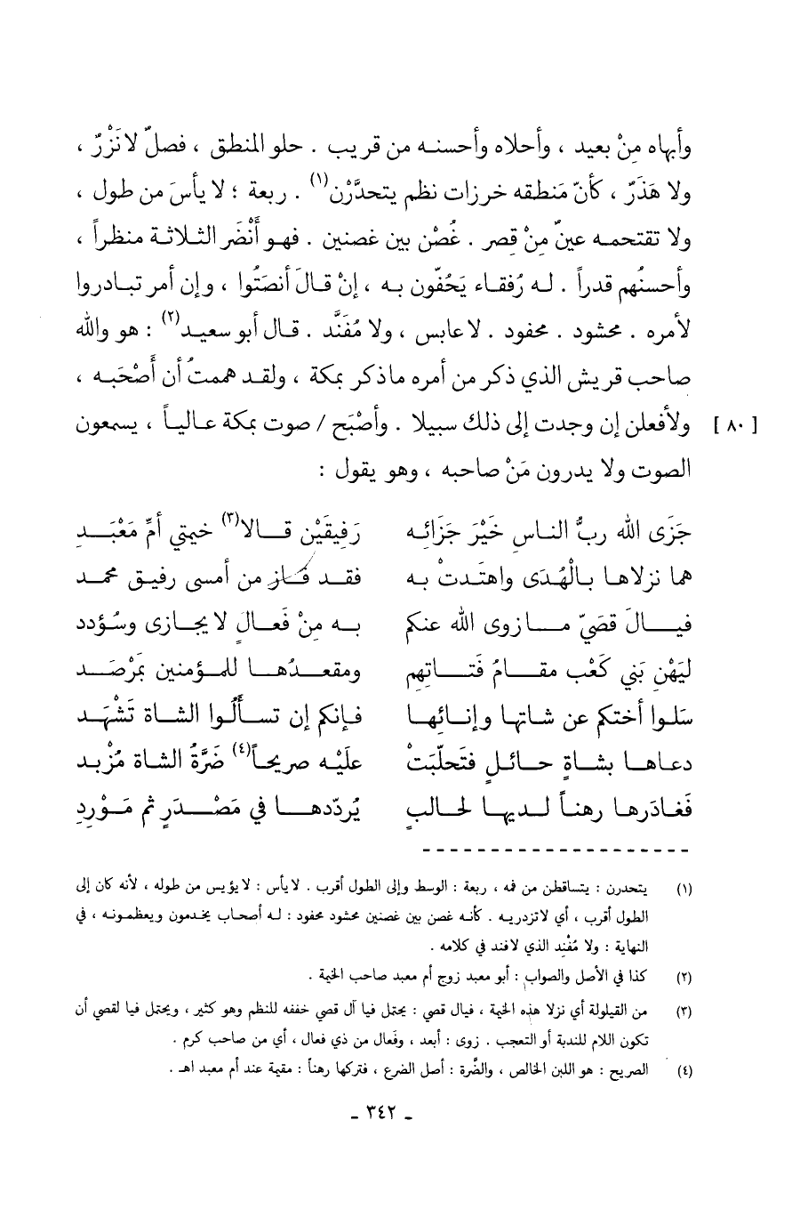 وأبهاه مِنْ بَعِيدٍ وَأَحْلاهُ وَأَحْسَنُهُ مِنْ قَرِيبٍ حُلْوُ الْمَنْطِقِ فَصْلٌ لا نَزْرٌ وَلا هَذْرٌ كَأَنَّ مَنْطِقَهُ خَرَزَاتُ نَظْمٍ يَتَحَدَّرْنَ ربعة لا يأس مِنْ طُولٍ وَلا تَقْتَحِمُهُ عَيْنٌ مِنْ قِصَرٍ غُصْنٌ بَيْنَ غُصْنَيْنِ فَهُوَ أَنْضَرُ الثَّلاثَةِ مَنْظَرًا وَأَحْسَنُهُمْ قَدْرًا لَهُ رُفَقَاءُ يَحُفُّونَ بِهِ إِنْ قَالَ أَنْصَتُوا وَإِنْ أَمَرَ تَبَادَرُوا لأَمْرِهِ مَحْشُودٌ مَحْفُودٌ لا عَابِسٌ وَلا مُفَنَّدٌ قَالَ أَبُو سَعِيدٍ هُوَ وَاللَّهِ صَاحِبُ قُرَيْشٍ الَّذِي ذُكِرَ مِنْ أَمْرِهِ مَا ذُكِرَ بِمَكَّةَ وَلَقَدْ هَمَمْتُ أَنْ أَصْحَبَهُ وَلأَفْعَلَنَّ إِنْ وَجَدْتُ إِلَى ذَلِكَ سَبِيلا وَأَصْبَحَ صَوْتٌ بِمَكَّةَ عَالِيًا يَسْمَعُونَ الصَّوْتَ وَلا يَدْرُونَ مَنْ صَاحِبُهُ وَهُوَ يَقُولُ جَزَى اللَّهُ رَبُّ النَّاسِ خَيْرَ جَزَائِهِ رَفِيقَيْنِ قَالا خَيْمَتَيْ أُمِّ مَعْبَدِ هُمَا نَزَلاهَا بِالْهُدَى وَاهْتَدَتْ بِهِ فَقَدْ فَازَ مَنْ أَمْسَى رَفِيقَ مُحَمَّدِ فَيَالَ قُصَيٍّ مَا زَوَى اللَّهُ عَنْكُمُ بِهِ مِنْ فِعَالٍ لا يُجَازَى وَسُؤْدَدِ لِيَهْنِ بَنِي كَعْبٍ مُقَامُ فَتَاتِهِمْ وَمَقْعَدُهَا لِلْمُؤْمِنِينَ بِمَرْصَدِ سَلُوا أُخْتَكُمْ عَنْ شَاتِهَا وَإِنَائِهَا فَإِنَّكُمْ إِنْ تَسْأَلُوا الشَّاةَ تَشْهَدِ دَعَاهَا بِشَاةٍ حَائِلٍ فَتَحَلَّبَتْ عَلَيْهِ صَرِيحًا ضَرَّةُ الشَّاةِ مُزْبِدِ فَغَادَرَهَا رَهْنًا لَدَيْهَا لِحَالِبٍ يُرَدِّدُهَا فِي مَصْدَرٍ ثُمَّ مَوْرِدِ