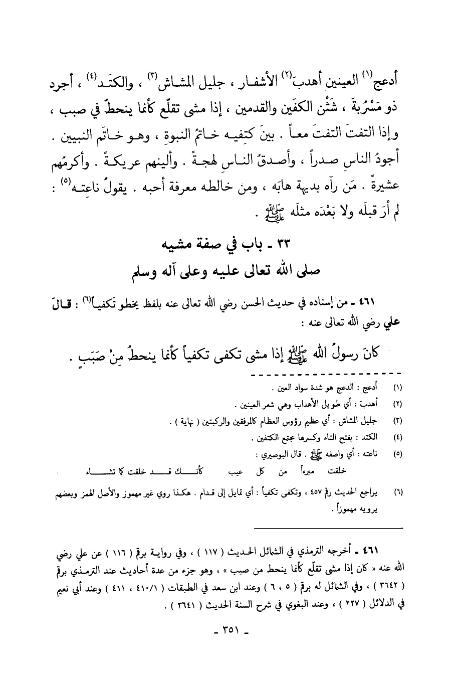 461 - مِنْ إِسْنَادِهِ فِي حَدِيثِ الْحَسَنِ رَضِيَ اللَّهُ تَعَالَى عَنْهُ بِلَفْظِ يَخْطُو تَكَفِّيًا قَالَ عَلِيٌّ رَضِيَ اللَّهُ تَعَالَى عَنْهُ كان رَسُولُ اللَّهِ صَلَّى اللهُ عَلَيْهِ وَسَلَّمَ إِذَا مَشَى تَكَفَّى تَكَفِّيًا كَأَنَّمَا يَنْحَطُّ مِنْ صَبَبٍ.