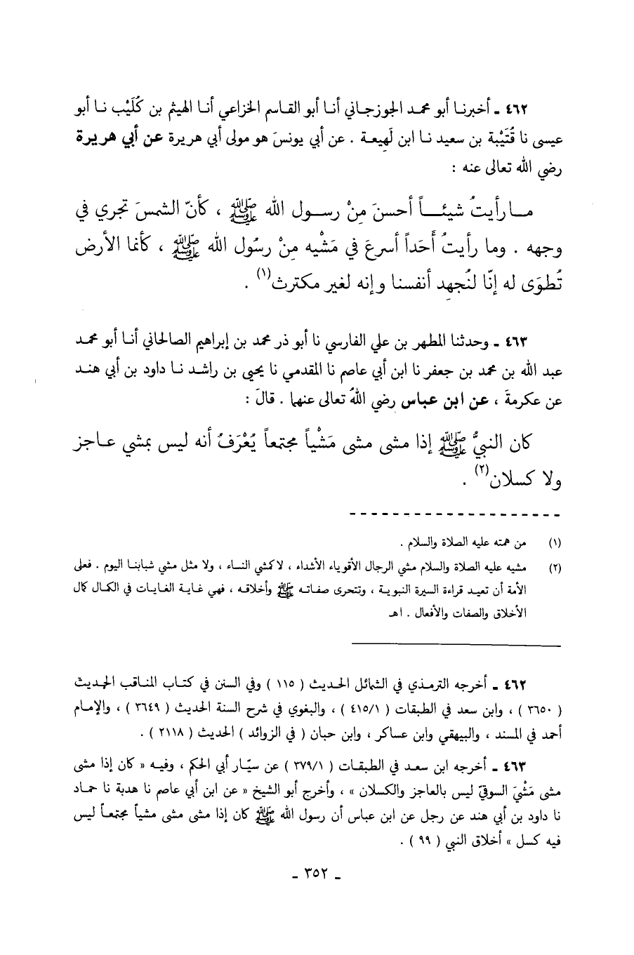 462 - أَخْبَرَنَا أَبُو مُحَمَّدٍ الْجُوزَجَانِيُّ أَنَا أَبُو الْقَاسِمِ الْخُزَاعِيُّ أَنَا الْهَيْثَمُ بْنُ كُلَيْبٍ نا أَبُو عِيسَى نا قُتَيْبَةُ بْنُ سَعِيدٍ نا ابْنُ لَهِيعَةَ عَنْ أَبِي يُونُسَ هُوَ مَوْلَى أَبِي هُرَيْرَةَ عَنْ أَبِي هُرَيْرَةَ رَضِيَ اللَّهُ تَعَالَى عَنْهُ مَا رَأَيْتُ شَيْئًا أَحْسَنَ مِنْ رَسُولِ اللَّهِ صَلَّى اللهُ عَلَيْهِ وَسَلَّمَ كَأَنَّ الشَّمْسَ تَجْرِي فِي وَجْهِهِ وَمَا رَأَيْتُ أَحَدًا أَسْرَعَ فِي مَشْيِهِ مِنْ رَسُولِ اللَّهِ صَلَّى اللهُ عَلَيْهِ وَسَلَّمَ كَأَنَّمَا الأَرْضُ تُطْوَى لَهُ إِنَّا لَنُجْهِدُ أَنْفُسَنَا وَإِنَّهُ لَغَيْرُ مُكْتَرِثٍ.