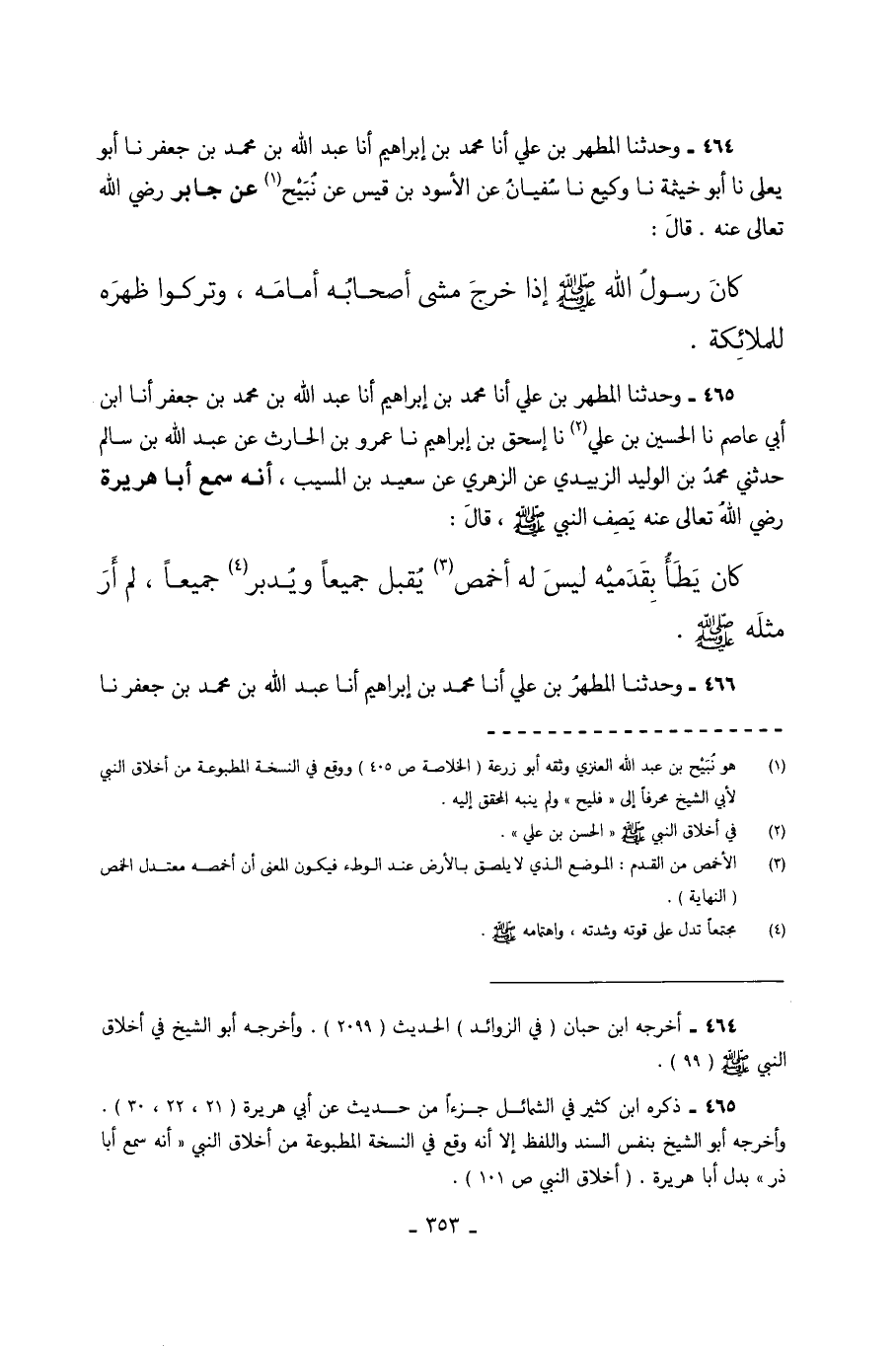 464 - وَحَدَّثَنَا الْمُطَهَّرُ بْنُ عَلِيٍّ أَنَا مُحَمَّدُ بْنُ إِبْرَاهِيمَ أَنَا عَبْدُ اللَّهِ بْنُ مُحَمَّدِ بْنِ جَعْفَرٍ نا أَبُو يَعْلَى نا أَبُو خَيْثَمَةَ نا وَكِيعٌ نا سُفْيَانُ عَنِ الأَسْوَدِ بْنِ قَيْسٍ عَنْ نُبَيْحٍ عَنْ جَابِرٍ رَضِيَ اللَّهُ تَعَالَى عَنْهُ قَالَ كَانَ رَسُولُ اللَّهِ صَلَّى اللهُ عَلَيْهِ وَسَلَّمَ إِذَا خَرَجَ مَشَى أَصْحَابُهُ أَمَامَهُ وَتَرَكُوا ظَهْرَهُ لِلْمَلائِكَةِ.