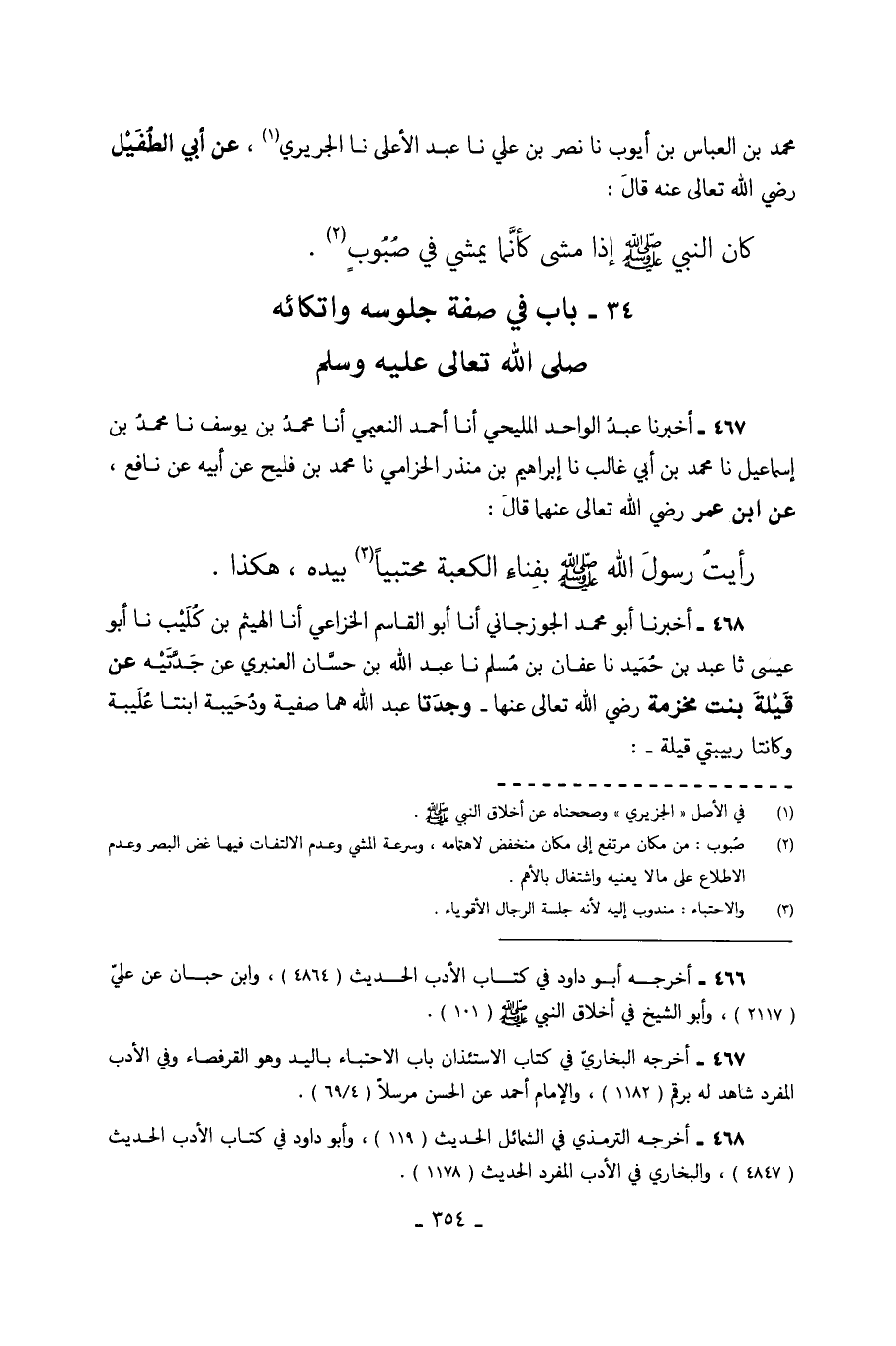 34- بَابٌ فِي صِفَةِ جُلُوسِهِ وَاتِّكَائِهِ صَلَّى اللَّهُ تَعَالَى عَلَيْهِ وَسَلَّمَ