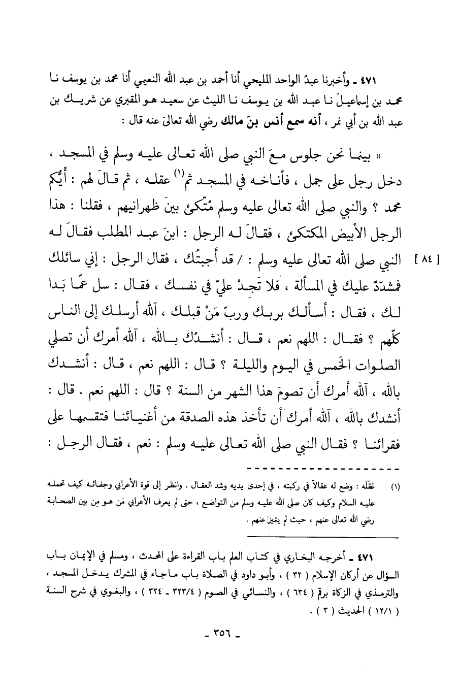 471 - وَأَخْبَرَنَا عَبْدُ الْوَاحِدِ الْمَلِيحِيُّ أَنَا أَحْمَدُ بْنُ عَبْدِ اللَّهِ النُّعَيْمِيُّ أَنَا مُحَمَّدُ بْنُ يُوسُفَ نا مُحَمَّدُ بْنُ إِسْمَاعِيلَ نا عَبْدُ اللَّهِ بْنُ يُوسُفَ نا اللَّيْثُ عَنْ سَعِيدٍ هُوَ الْمَقْبُرِيُّ عَنْ شَرِيكِ بْنِ عَبْدِ اللَّهِ بْنِ أَبِي نَمِرٍ أَنَّهُ سَمِعَ أَنَسَ بْنَ مَالِكٍ رَضِيَ اللَّهُ تَعَالَى عَنْهُ قَالَ بَيْنَمَا نَحْنُ جُلُوسٌ مَعَ النَّبِيِّ صَلَّى اللَّهُ تَعَالَى عَلَيْهِ وَسَلَّمَ فِي الْمَسْجِدِ دَخَلَ رَجُلٌ عَلَى جَمَلٍ فَأَنَاخَهُ فِي الْمَسْجِدِ ثُمَّ عَقَلَهُ ثُمَّ قَالَ لَهُمْ أَيُّكُمْ مُحَمَّدٌ وَالنَّبِيُّ صَلَّى اللَّهُ تَعَالَى عَلَيْهِ وَسَلَّمَ مُتَّكِئٌ بَيْنَ ظَهْرَانِيهِمْ فَقُلْنَا هَذَا الرَّجُلُ الأَبْيَضُ الْمُتَّكِئُ فَقَالَ لَهُ الرَّجُلُ ابْنُ عَبْدِ الْمُطَّلِبِ فَقَالَ لَهُ النَّبِيُّ صَلَّى اللَّهُ تَعَالَى عَلَيْهِ وَسَلَّمَ قَدْ أَجَبْتُكَ فَقَالَ الرَّجُلُ إِنِّي سَائِلُكَ فَمُشَدِّدٌ عَلَيْكَ فِي الْمَسْأَلَةِ فَلا تَجِدْ عَلَيَّ فِي نَفْسِكَ فَقَالَ سَلْ عَمَّا بَدَا لَكَ فَقَالَ أَسْأَلُكَ بِرَبِّكَ وَرَبِّ مَنْ قَبْلَكَ آللَّهُ أَرْسَلَكَ إِلَى النَّاسِ كُلِّهِمْ فَقَالَ اللَّهُمَّ نَعَمْ قَالَ أَنْشُدُكَ بِاللَّهِ آللَّهُ أَمَرَكَ أَنْ تُصَلِّيَ الصَّلَوَاتِ الْخَمْسَ فِي الْيَوْمِ وَاللَّيْلَةِ قَالَ اللَّهُمَّ نعَمْ قَالَ أَنْشُدُكَ بِاللَّهِ آللَّهُ أَمَرَك أَنْ تَصُومَ هَذَا الشَّهْرِ مِنَ السَّنَةِ قَالَ اللَّهُمَّ نَعَمْ قَالَ أَنْشُدُكَ بِاللَّهِ آللَّهُ أَمَرَكَ أَنْ تَأْخُذَ هَذِهِ الصَّدَقَةَ مِنْ أَغْنِيَائِنَا فَتُقَسِّمَهَا عَلَى فُقَرَائِنَا فَقَالَ النَّبِيُّ صَلَّى اللَّهُ تَعَالَى عَلَيْهِ وَسَلَّمَ نَعَمْ فَقَالَ الرَّجُلُ