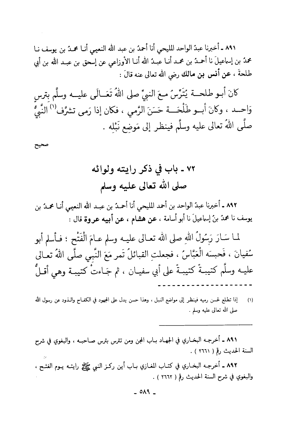 891 - أَخْبَرَنَا عَبْدُ الْوَاحِدِ الْمَلِيحِيُّ أَنَا أَحْمَدُ بْنُ عَبْدِ اللَّهِ النُّعَيْمِيُّ أَنَا مُحَمَّدُ بْنُ يُوسُفَ نَا مُحَمَّدُ بْنُ إِسْمَاعِيلَ نَا أَحْمَدُ بْنُ مُحَمَّدٍ أَنَا عَبْدُ اللَّهِ أَنَا الأوزاعي عن إسحق بْنِ عَبْدِ اللَّهِ بْنِ أَبِي طَلْحَةَ عَنْ أَنَسِ بْنِ مَالِكٍ رَضِيَ اللَّهُ تَعَالَى عَنْهُ قَالَ كَانَ أَبُو طَلْحَةَ يُتَرِّسُ مَعَ النَّبِيِّ صَلَّى اللَّهُ تَعَالَى عَلَيْهِ وَسَلَّمَ بِتُرْسٍ وَاحِدٍ وَكَانَ أَبُو طَلْحَةَ حَسَنَ الرَّمْيِ فَكَانَ إِذَا رَمَى تَشَرَّفَ النَّبِيُّ صَلَّى اللَّهُ تَعَالَى عَلَيْهِ وَسَلَّمَ فَيَنْظُرُ إِلَى موضع نبله. صحيح