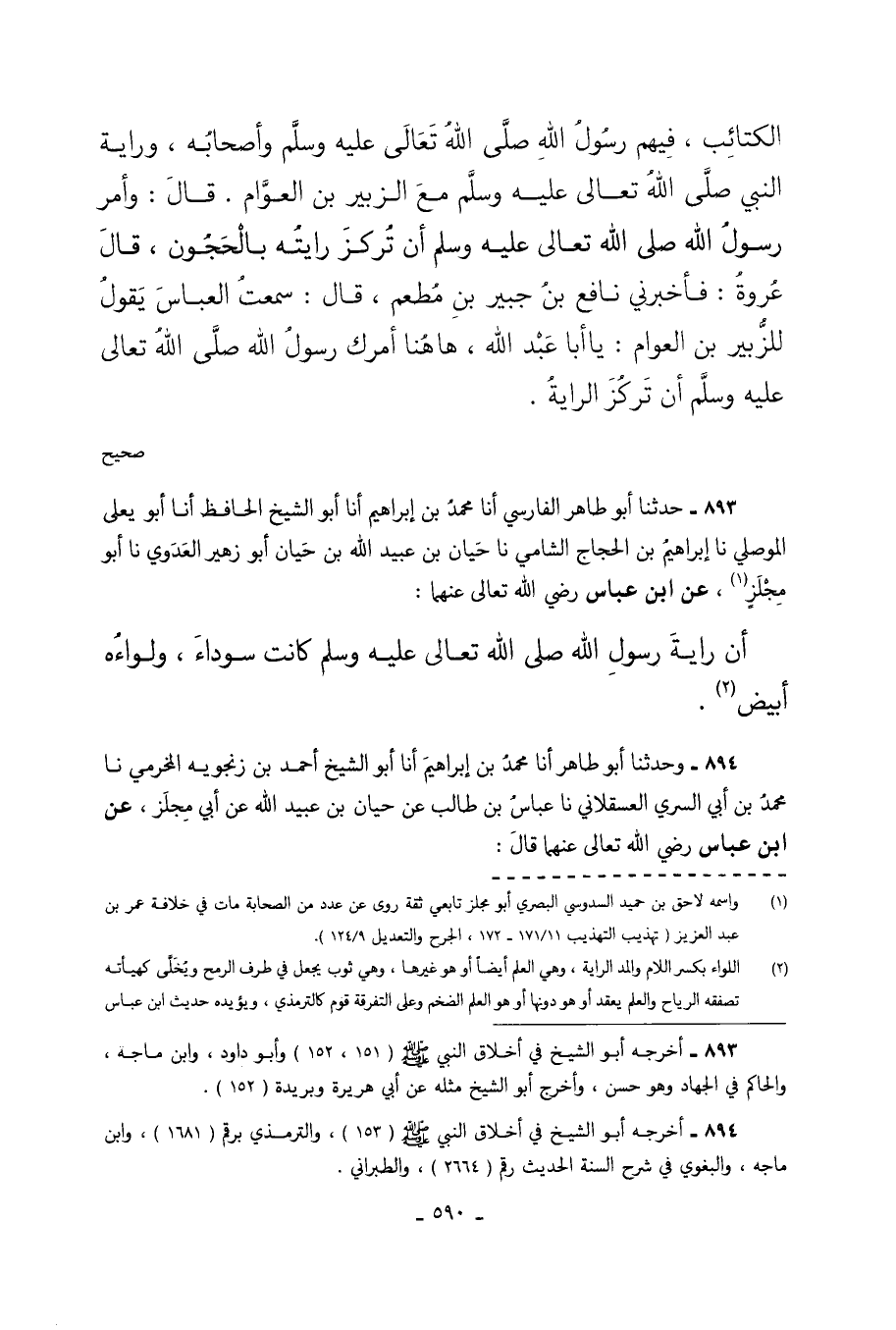 893 - حَدَّثَنَا أَبُو طَاهِرٍ الْفَارِسِيُّ أَنَا مُحَمَّدُ بْنُ إِبْرَاهِيمَ أَنَا أَبُو الشَّيْخِ الْحَافِظُ أَنَا أَبُو يَعْلَى الْمَوْصِلِيُّ نَا إبْرَاهِيمُ بْنُ الحجاج الشامي ناحيان بْنُ عُبَيْدِ اللَّهِ بْنِ حَيَّانَ أَبُو زُهَيْرٍ الْعَدَوِيُّ نَا أَبُو مِجْلَزٍ عَنِ ابْنِ عَبَّاسٍ رَضِيَ اللَّهُ تَعَالَى عَنْهُمَا أَنَّ رَايَةَ رَسُولِ اللَّهِ صَلَّى اللَّهُ تَعَالَى عَلَيْهِ وَسَلَّمَ كانت سوداء ولواءه أَبْيَضَ.