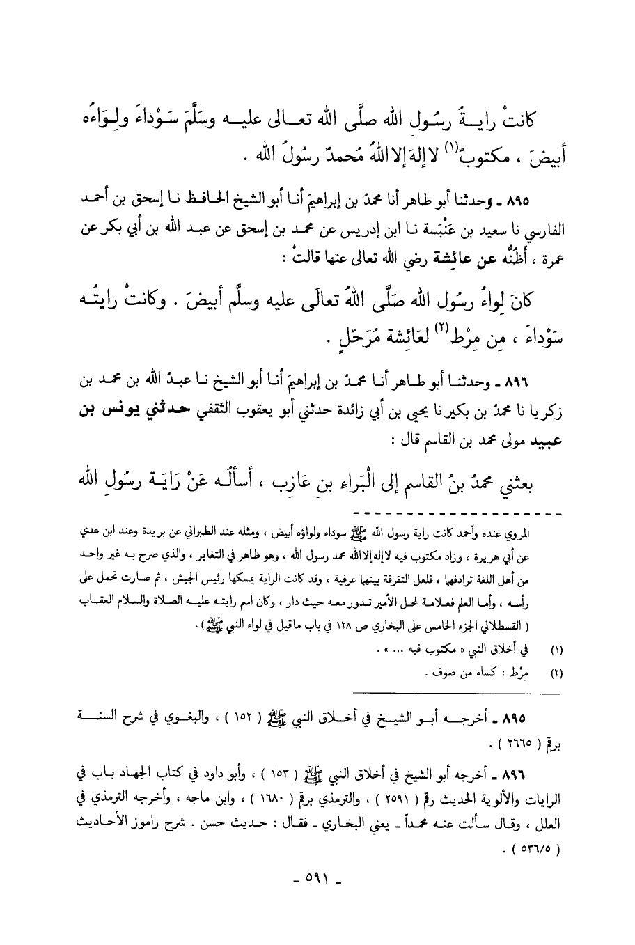 895 - وَحَدَّثَنَا أَبُو طَاهِرٍ أَنَا مُحَمَّدُ بْنُ إِبْرَاهِيمَ أَنَا أَبُو الشَّيْخِ الحافظ نا إسحق بْنُ أَحْمَدَ الْفَارِسِيُّ نَا سَعِيدُ بْنُ عَنْبَسَةَ نَا ابْنُ إِدْرِيسَ عَنْ محمد بن إسحق عَنْ عَبْدِ اللَّهِ بْنِ أَبِي بَكْرٍ عَنْ عَمْرَةَ أَظُنُّهُ عَنْ عَائِشَةَ رَضِيَ اللَّهُ تَعَالَى عَنْهَا قَالَتْ كَانَ لِوَاءُ رَسُولِ اللَّهِ صَلَّى اللَّهُ تَعَالَى عليه وسلم أببيض وَكَانَتْ رَايَتُهُ سَوْدَاءَ مِنْ مِرْطٍ لِعَائِشَةَ مُرَحَّلٍ.