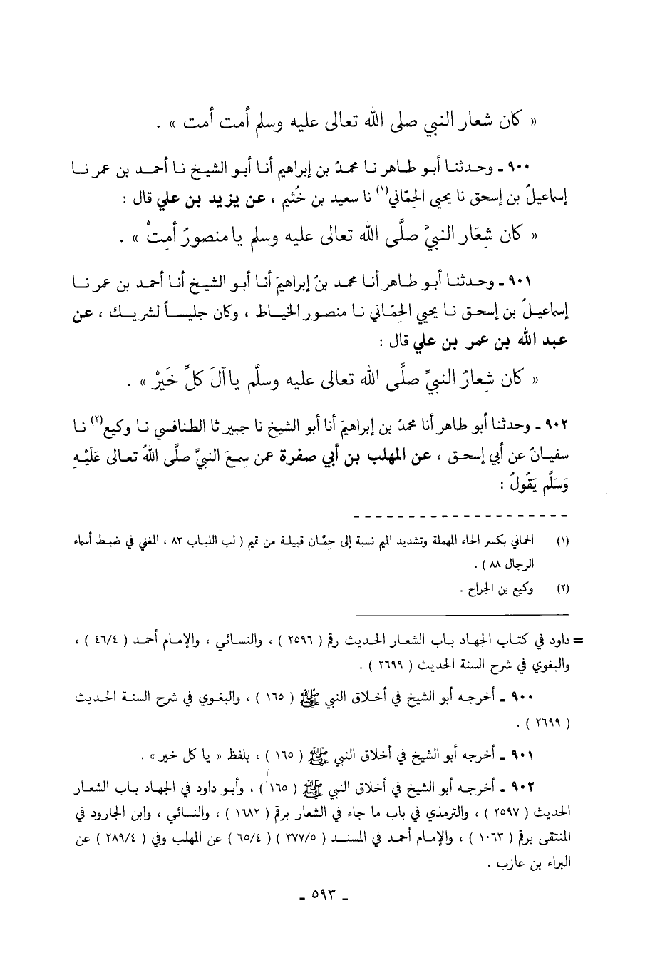 901 - وَحَدَّثَنَا أَبُو طَاهِرٍ أَنَا مُحَمَّدُ بْنُ إِبْرَاهِيمَ أَنَا أَبُو الشَّيْخِ أَنَا أَحْمَدُ بْنُ عُمَرَ نَا إسماعيل بن إسحق نَا يَحْيَى الْحِمَّانِيُّ نَا مَنْصُورٌ الْخَيَّاطُ وَكَانَ جَلِيسًا لِشَرِيكٍ عَنْ عَبْدِ اللَّهِ بْنِ عُمَرَ بْنِ عَلِيٍّ قَالَ كَانَ شِعَارُ النَّبِيِّ صَلَّى اللَّهُ تَعَالَى عَلَيْهِ وَسَلَّمَ يَا آلَ كُلِّ خَيْرٍ.