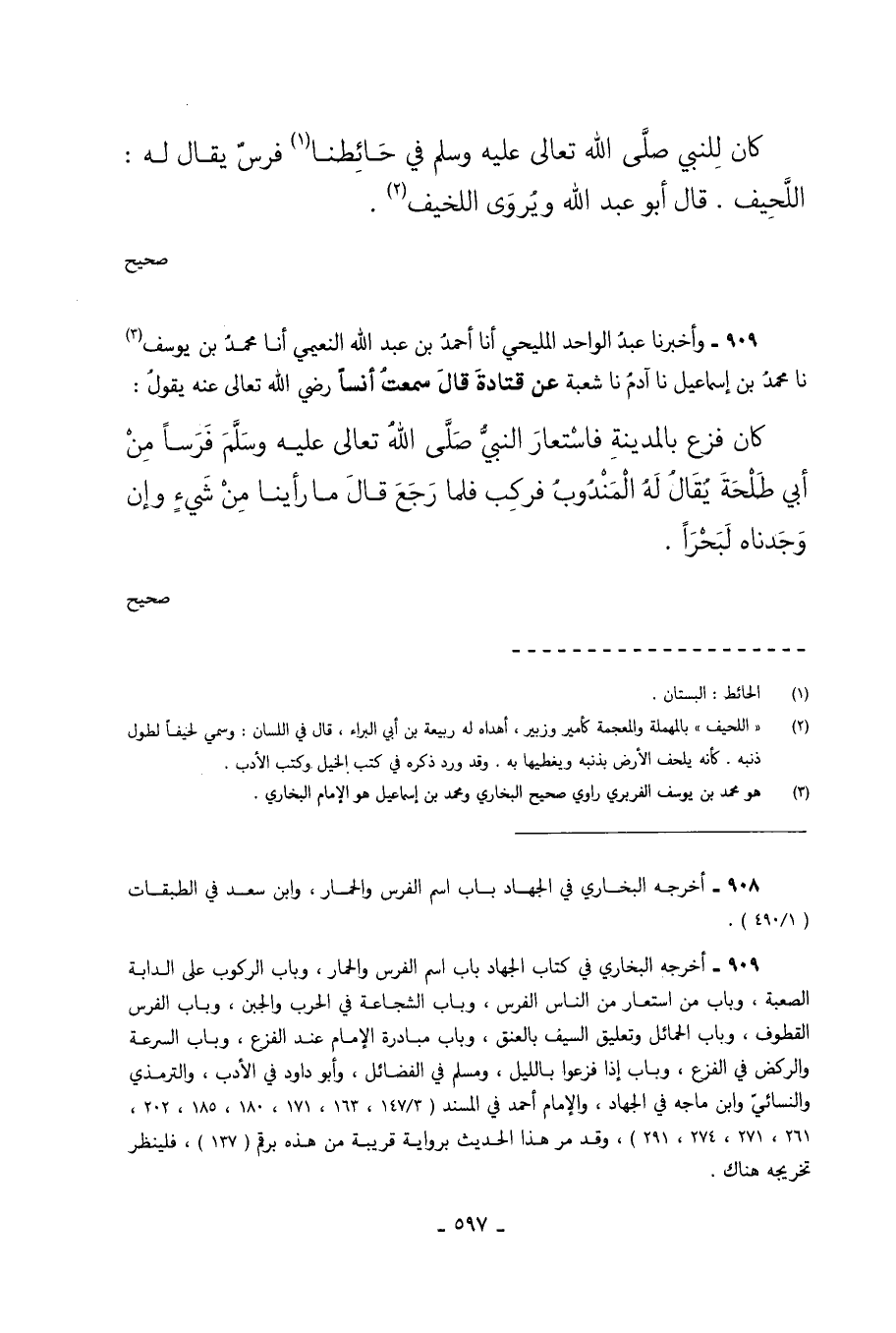 كَانَ لِلنَّبِيِّ صَلَّى اللَّهُ تَعَالَى عَلَيْهِ وَسَلَّمَ فِي حَائِطِنَا فَرَسٌ يُقَالُ لَهُ اللَّحِيفُ قَالَ أَبُو عَبْدِ اللَّهِ ويروى اللخيف. صحيح