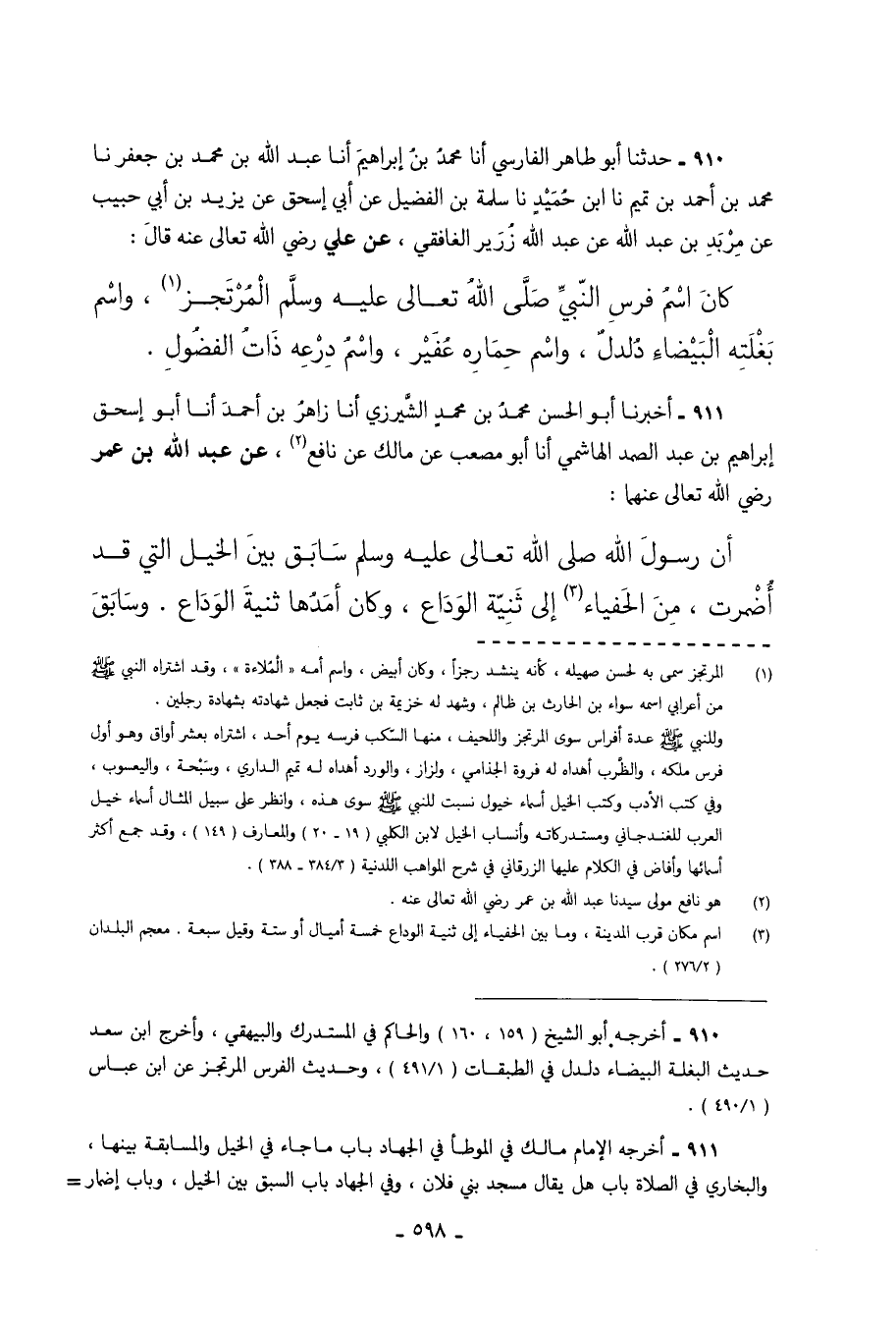 911 - أَخْبَرَنَا أَبُو الْحَسَنِ مُحَمَّدُ بْنُ مُحَمَّدٍ الشِّيرَزِيُّ أَنَا زَاهِرُ بْنُ أَحْمَدَ أنا أبو إسحق إِبْرَاهِيمُ بْنُ عَبْدِ الصَّمَدِ الْهَاشِمِيُّ أَنَا أَبُو مُصْعَبٍ عَنْ مَالِكٍ عَنْ نَافِعٍ عَنْ عَبْدِ اللَّهِ بْنِ عُمَرَ رَضِيَ اللَّهُ تَعَالَى عَنْهُمَا أَنَّ رَسُولَ اللَّهِ صَلَّى اللَّهُ تَعَالَى عَلَيْهِ وَسَلَّمَ سَابَقَ بَيْنَ الْخَيْلِ الَّتِي قَدْ أُضْمِرَتْ مِنَ الْحَفْيَاءِ إِلَى ثَنِيَّةِ الْوَدَاعِ وَكَانَ أَمَدُهَا ثَنِيَّةَ الْوَدَاعِ وَسَابَقَ