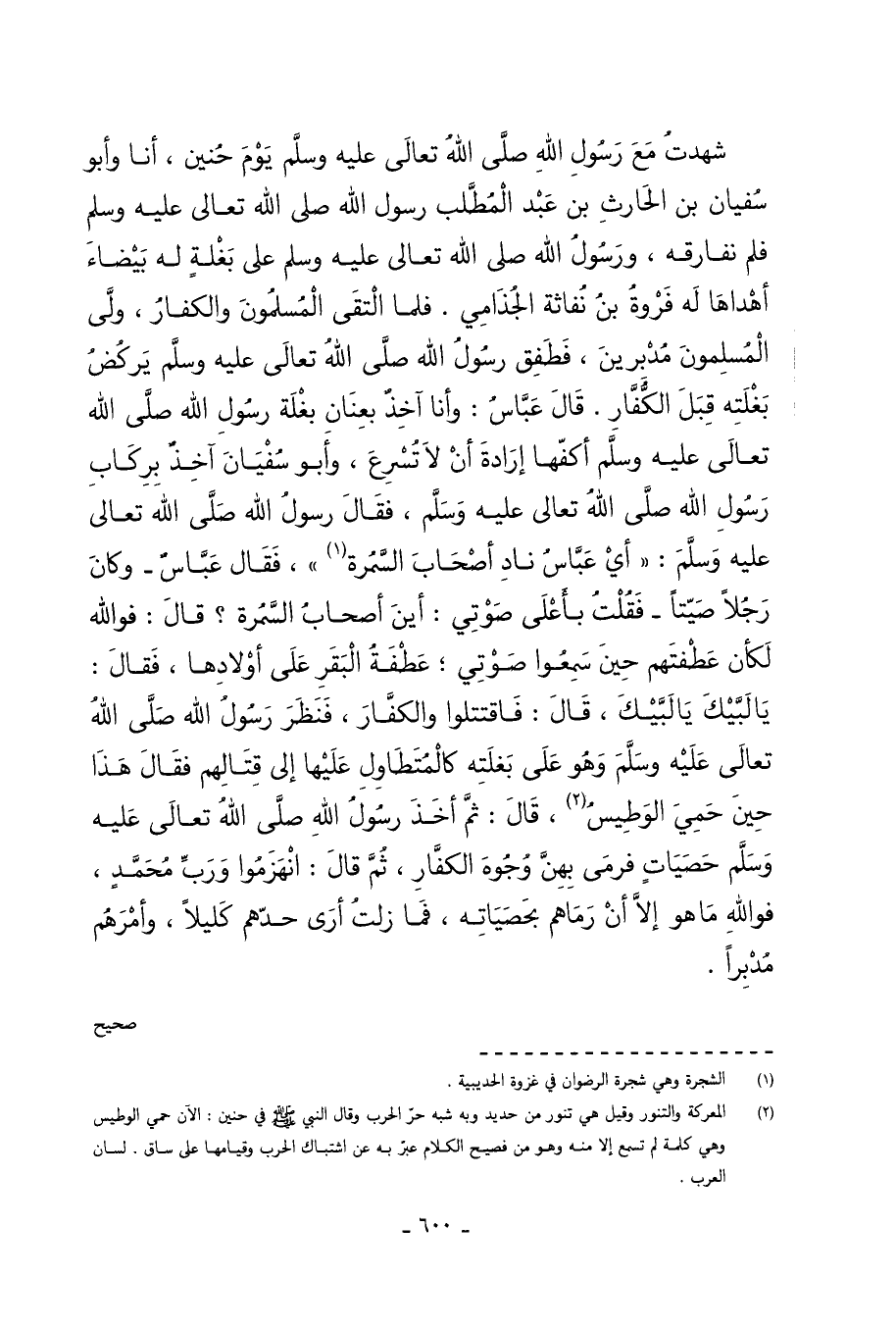 شَهِدْتُ مَعَ رَسُولِ اللَّهِ صَلَّى اللَّهُ تَعَالَى عَلَيْهِ وَسَلَّمَ يَوْمَ حُنَيْنٍ أَنَا وَأَبُو سُفْيَانَ بْنُ الْحَارِثِ بْنِ عَبْدِ الْمُطَّلِبِ رَسُولَ اللَّهِ صَلَّى اللَّهُ تَعَالَى عَلَيْهِ وَسَلَّمَ فَلَمْ نُفَارِقْهُ وَرَسُولُ اللَّهِ صَلَّى اللَّهُ تَعَالَى عَلَيْهِ وَسَلَّمَ عَلَى بَغْلَةٍ لَهُ بَيْضَاءَ أَهْدَاهَا لَهُ فَرْوَةُ بْنُ نُفَاثَةَ الْجُذَامِيُّ فَلَمَّا الْتَقَى الْمُسْلِمُونَ وَالْكُفَّارُ وَلَّى الْمُسْلِمُونَ مُدْبِرِينَ فَطَفِقَ رَسُولُ اللَّهِ صَلَّى اللَّهُ تَعَالَى عَلَيْهِ وَسَلَّمَ يَرْكُضُ بَغْلَتَهُ قِبَلَ الْكُفَّارِ قَالَ عَبَّاسٌ وَأَنَا آخِذٌ بِعِنَانِ بَغْلَةِ رَسُولِ اللَّهِ صَلَّى اللَّهُ تَعَالَى عَلَيْهِ وَسَلَّمَ أَكُفُّهَا إِرَادَةَ أَنْ لا تُسْرِعَ وَأَبُو سُفْيَانَ آخِذٌ بِرِكَابِ رَسُولِ اللَّهِ صَلَّى اللَّهُ تَعَالَى عَلَيْهِ وَسَلَّمَ فَقَالَ رَسُولُ اللَّهِ صَلَّى اللَّهُ تَعَالَى عَلَيْهِ وَسَلَّمَ أَيْ عَبَّاسُ نَادِ أَصْحَابَ السَّمُرَةِ فَقَالَ عَبَّاسٌ وَكَانَ رَجُلا صَيِّتًا فَقُلْتُ بِأَعْلَى صَوْتِي أَيْنَ أَصْحَابُ السَّمُرَةِ قَالَ فَوَاللَّهِ لَكَأَنَّ عَطْفَتَهُمْ حِينَ سَمِعُوا صَوْتِي عَطْفَةُ الْبَقَرِ عَلَى أَوْلادِهَا فَقَالَ يَا لَبَّيْكَ يَا لَبَّيْكَ قَالَ فَاقْتَتَلُوا وَالْكُفَّارَ فَنَظَرَ رَسُولُ اللَّهِ صَلَّى اللَّهُ تَعَالَى عَلَيْهِ وَسَلَّمَ وَهُوَ عَلَى بَغْلَتِهِ كَالْمُتَطَاوِلِ عَلَيْهَا إِلَى قِتَالِهِمْ فَقَالَ هَذَا حِينَ حَمِيَ الْوَطِيسُ قَالَ ثُمَّ أَخَذَ رَسُولُ اللَّهِ صَلَّى اللَّهُ تَعَالَى عَلَيْهِ وَسَلَّمَ حَصَيَاتٍ فَرَمَى بِهِنَّ وُجُوهَ الْكُفَّارِ ثُمَّ قَالَ انْهَزَمُوا وَرَبِّ مُحَمَّدٍ فَوَاللَّهِ مَا هُوَ إِلا أَنْ رَمَاهُمْ بِحَصَيَاتِهِ فَمَا زِلْتُ أَرَى حَدَّهُمْ كَلِيلا وأمرهم مدبرا. صحيح