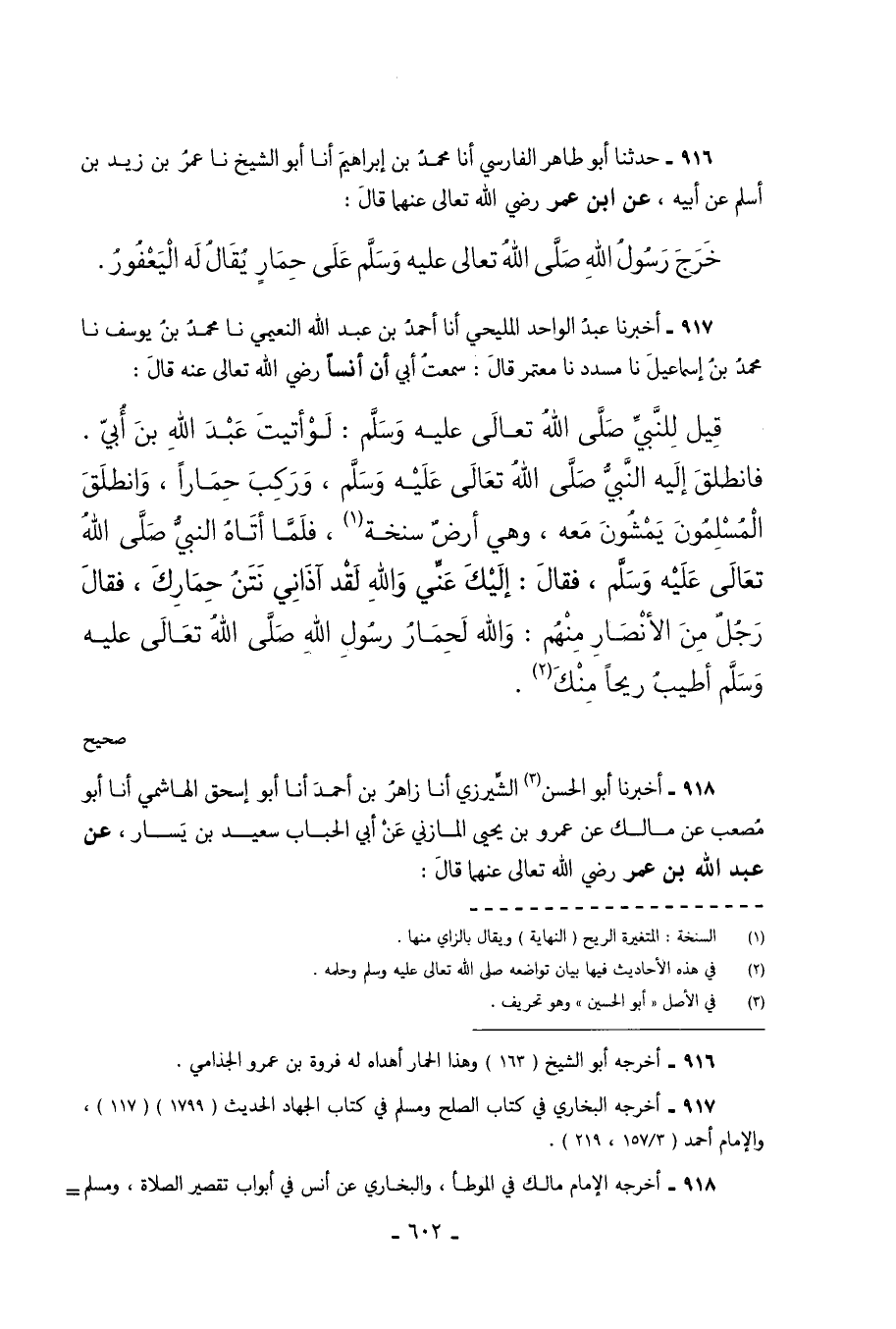 916 - حَدَّثَنَا أَبُو طَاهِرٍ الْفَارِسِيُّ أَنَا مُحَمَّدُ بْنُ إِبْرَاهِيمَ أَنَا أَبُو الشَّيْخِ نا عُمَرُ بْنُ زَيْدِ بْنِ أَسْلَمَ عَنْ أَبِيهِ عَنِ ابْنِ عُمَرَ رَضِيَ اللَّهُ تَعَالَى عَنْهُمَا قَالَ خَرَجَ رَسُولُ اللَّهِ صَلَّى اللَّهُ تَعَالَى عَلَيْهِ وَسَلَّمَ عَلَى حِمَارٍ يُقَالُ لَهُ الْيَعْفُورُ.